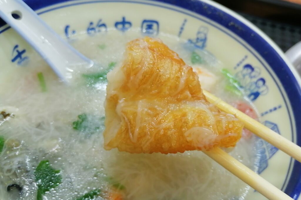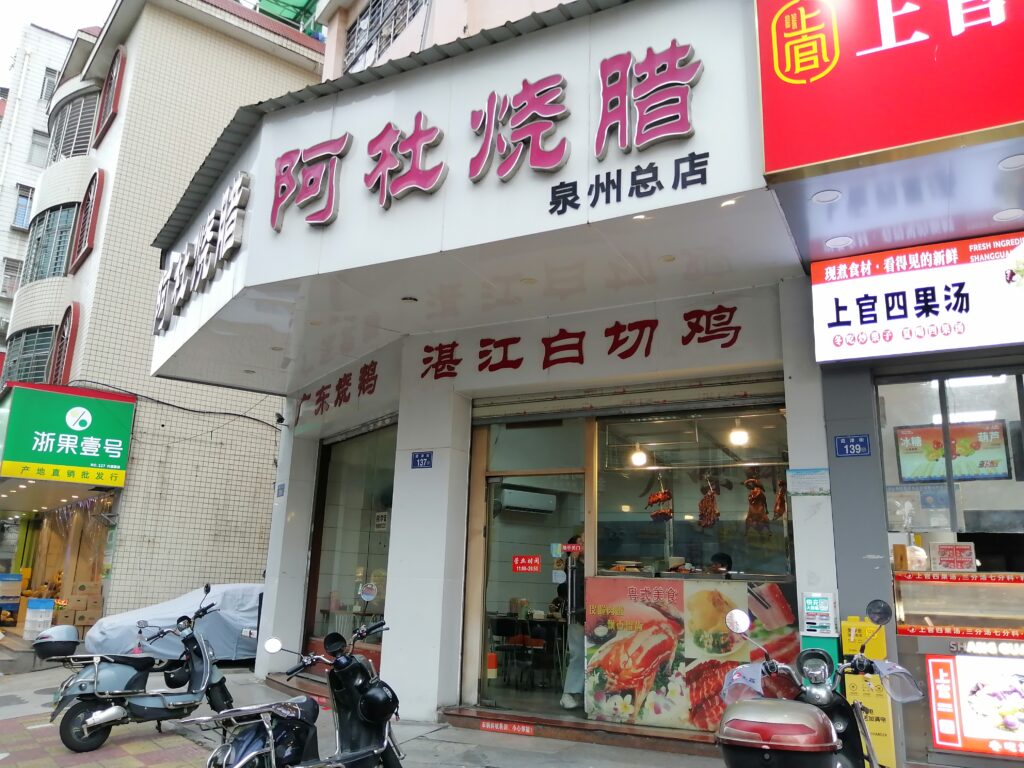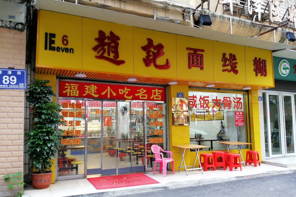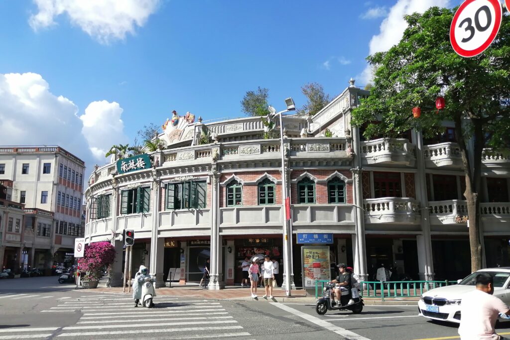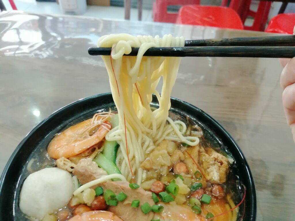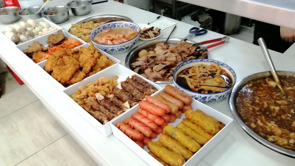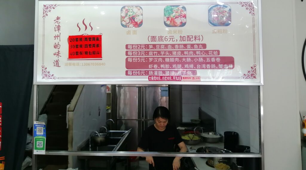中山路で漳州滷麺 孔子廟を見学後、中山路に至り北上する。中山路の周囲には多くの西洋古建築が残り、歩きながら鑑賞する。途中、腹ごしらえに閔南伝統食「漳州滷麺」を食べる。店名は「阿芬卤面(花巷店)」。トッピングは自分で選ぶスタイルで、少し面倒だなと感じた。ただ後で冷静に考えると、その時の体調に応じて具材の種類や量を調節できるので便利だとも言える。漳州滷麺の説明は百度百科より引用する。