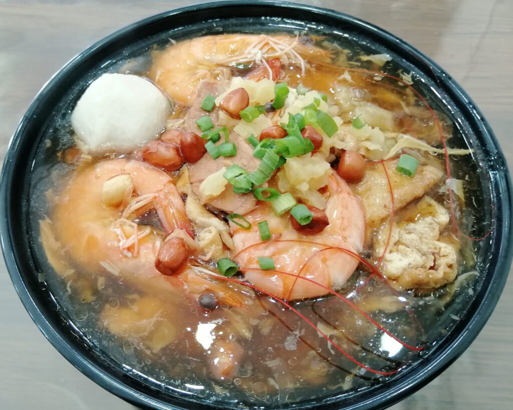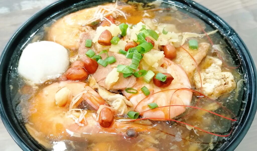 漳州卤面是闽菜系中具有1300余年历史的传统面食,其形成与唐代北方移民南迁时将面食习俗融入闽南饮食文化相关。该菜品以碱面为基础,配以猪骨高汤熬制的卤汤,核心工艺在于用肉丝、笋丝、香菇、鱿鱼干等十余种食材炒制卤料,辅以番薯粉或莲蕉粉勾芡形成浓稠质地。作为漳州婚嫁、乔迁等喜庆场合的标志性食品,其食用时需搭配油炸蒜丁、豆芽、香菜等佐料,形成”肉、海鲜、蔬菜三位一体”的复合风味。