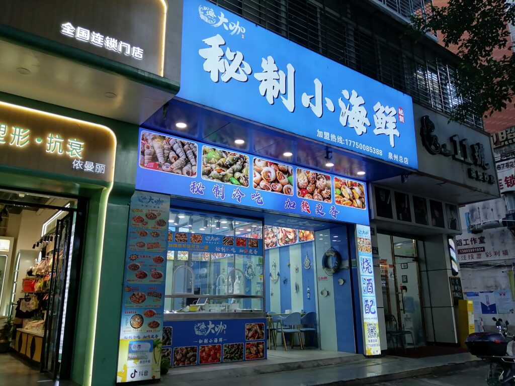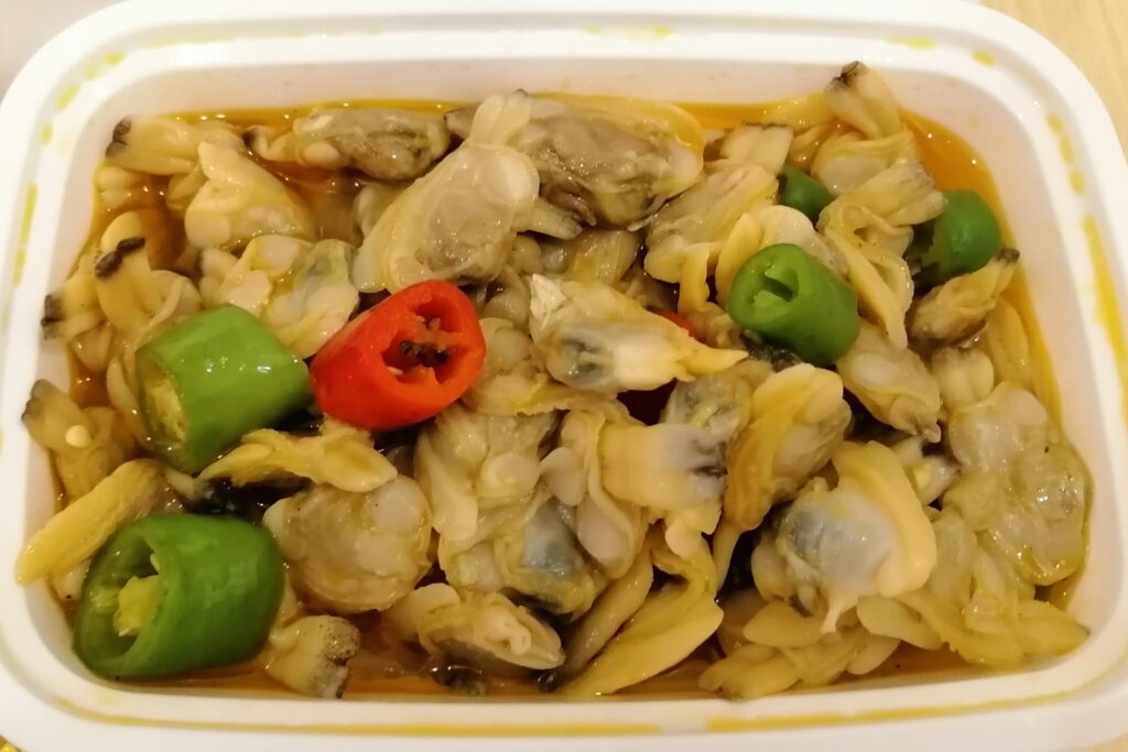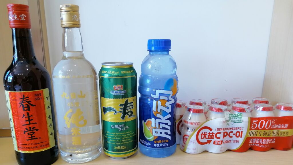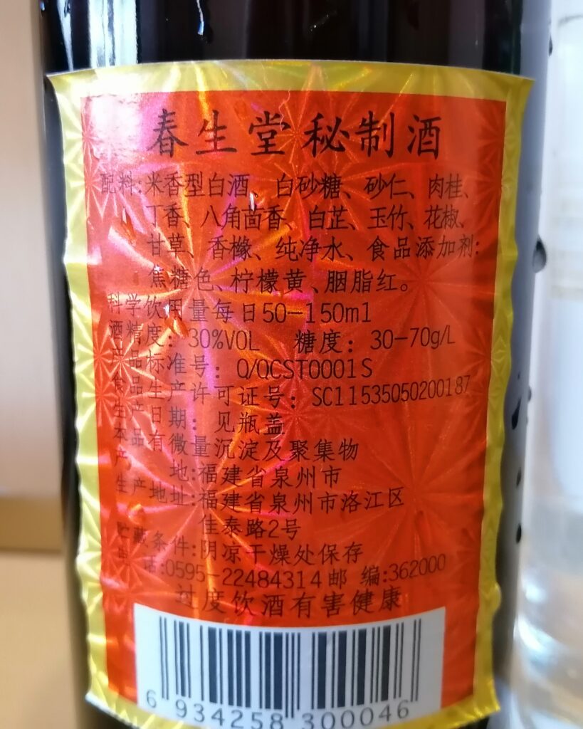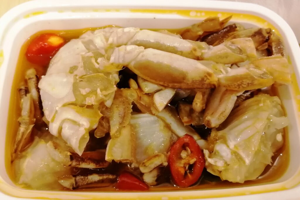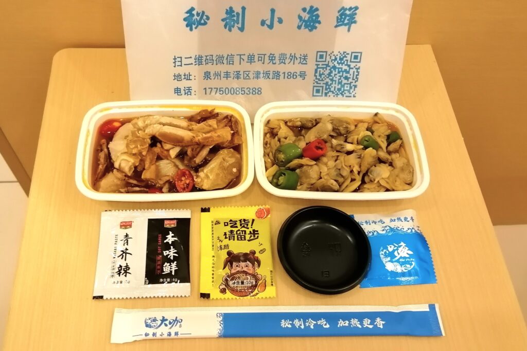 晩酌タイム 開元寺の見学を終え、ホテルへ戻る。途中、海鮮惣菜屋さんで貝と蟹の冷菜二種を酒の肴に購入。 泉州は沿海都市だけあって哈爾濱に比べると街で海産物を見る機会が多い。酒はホテル・チェックイン前に近くのスーパーで地元の薬膳酒「春生堂・秘制酒」と焼酎「順徳堂・九日山純米酒」を購入しておいた。