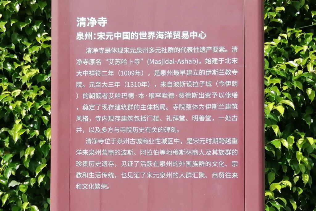清浄寺 関岳廟の隣にあるイスラム寺院。現地の説明によると創建は北宋大中祥符二年(1009)。泉州は海のシルクロードの起点として外来文化の影響を強く受けた都市なのである。説明は百度百科より引用する。