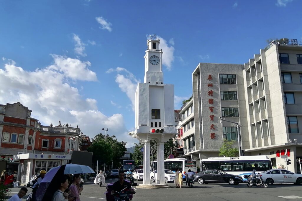 泉州鐘楼 食後は再び中山路を北上する。 すると前方奥に変わった形の白い物体が見える。さらに近づくと中山路と東街・西街の境にある交差点に設置された信号機だということが分かる。これは泉州のランドマーク「泉州鐘楼」。これまで中国各地を色々旅してきたが、このタイプの信号機を見るのは初めて。なかなか個性的で愛嬌もありイイ感じだ。説明は百度百科より引用する。