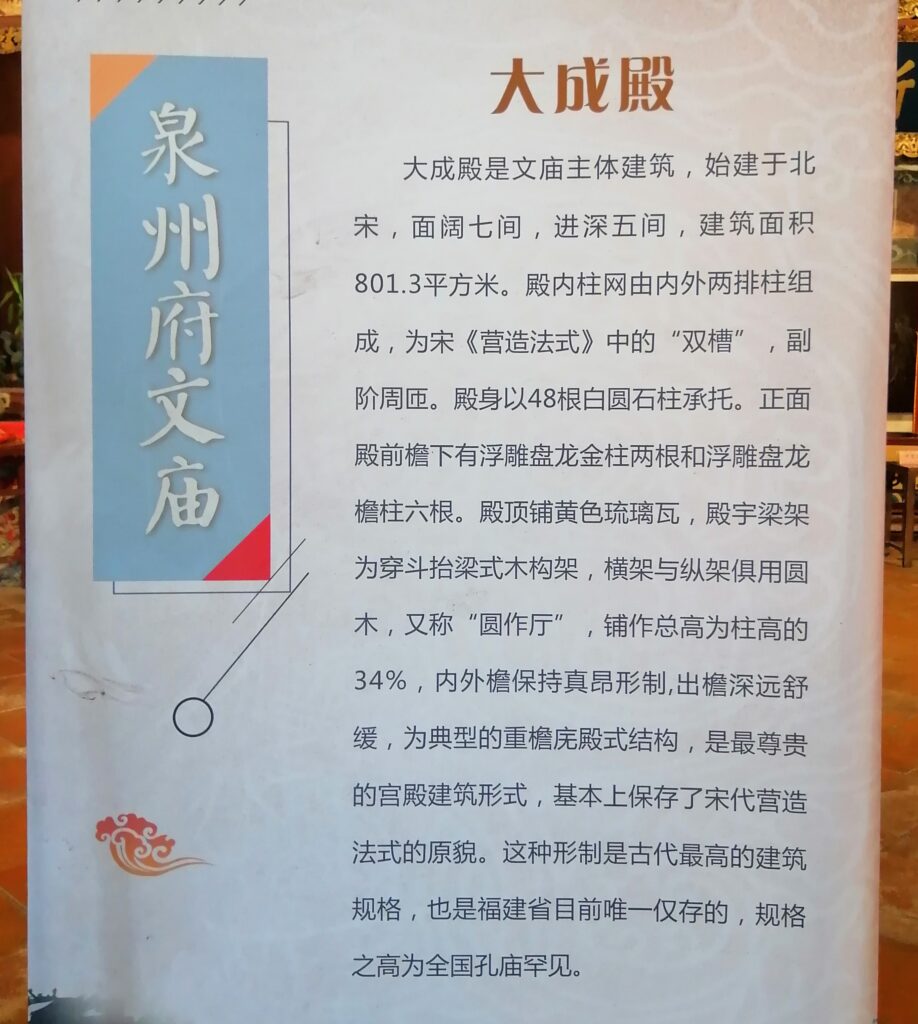 泉州府文庙是中国东南现存规模最大,包含宋、元、明、清四个朝代建筑形式于一体的孔庙古建筑群。整体建筑坐北朝南,主体建筑贯穿于南北中轴线上,有大成门、金声门、玉振门、东西庑、大成殿等,皆保留着宋代石质建筑基础、台基等。建筑木构件为清代按原貌复建。