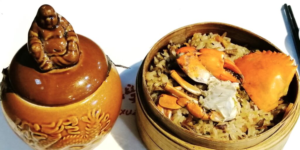 學軍盛記 午後4時、店に到着。屋号の「學軍盛記」、勇ましさを感じる。この店は庶民相手で安くおいしい料理を提供する。私が注文したのは「佛跳牆」(35元)+「紅蟳飯」(20元)。どちらも有名な福建料理。それらを高い値段で提供する店も多いが、私はおひとり様。量が少なくても安いのは助かる。それぞれの説明は百度百科より引用。