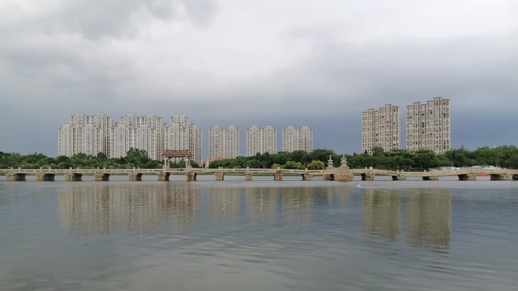見龍台 龍は見えないが、泉州の高層ビル群とその奥の山並みが眺められる。当時は市内を流れる普江が龍のように美しく見えていたのであろう。