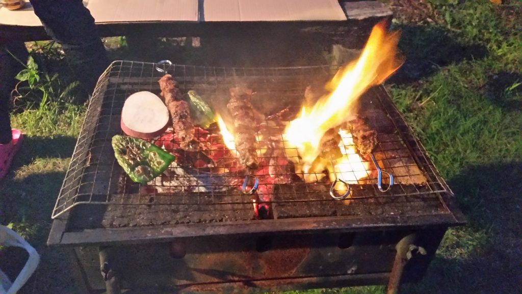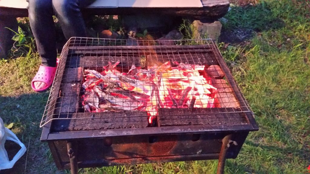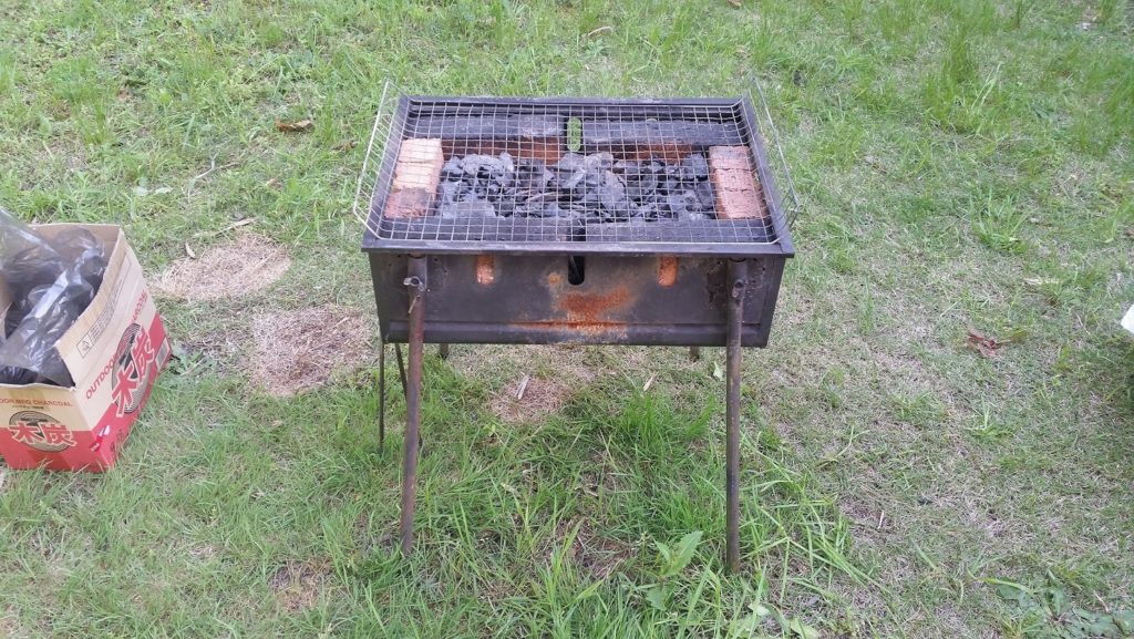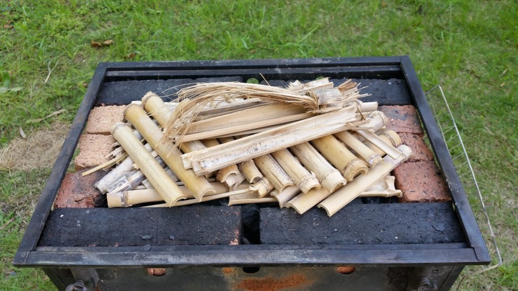 次は、炭焼きコンロを準備する。着火剤として乾燥させた竹を使用した。火が全体に広がったら、後は肉を焼くだけだ。
