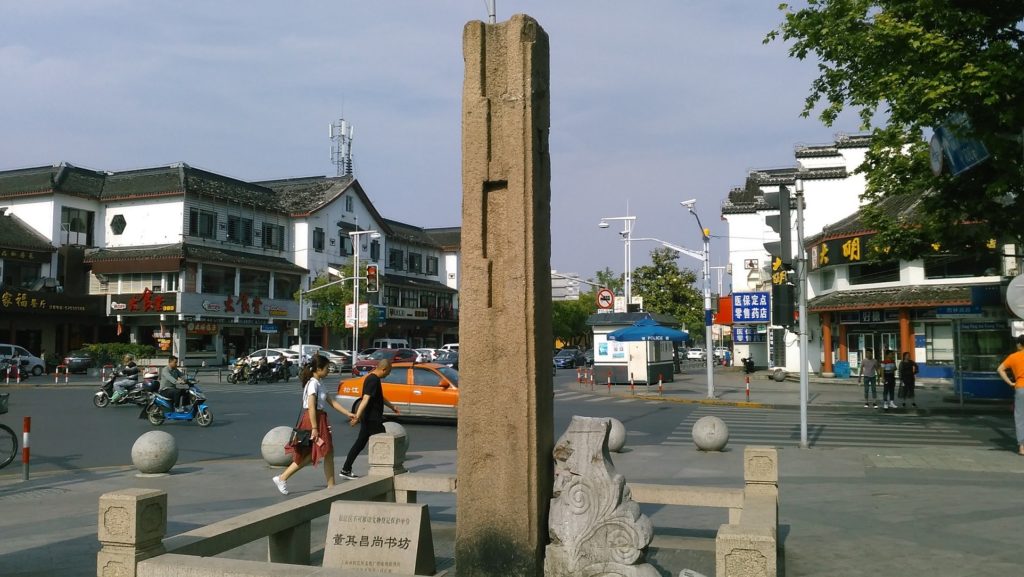 ★董其昌尚書坊 「坊」とは「牌坊」のことで、門の一種である(参考:周荘の牌坊)。そしてこの牌坊は董其昌を顕彰するために建てられたのであろう。現在は一本の石柱と夾杆石(柱の支え)の一部のみが残る。