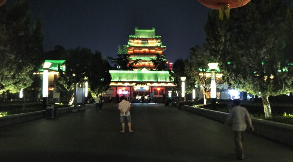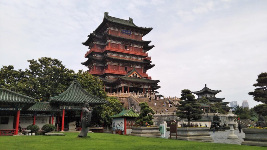 滕王閣  なかなか堂々としていて見ごたえのある楼閣である。楼閣から望む贛江(かんこう)は音もなく静かではあるが、流れは滔々としていて大陸の力強さを感じる。夜になると楼閣は電飾でキラキラ輝いていて非常に魅惑的である。詳細はウィキペディアから引用する。