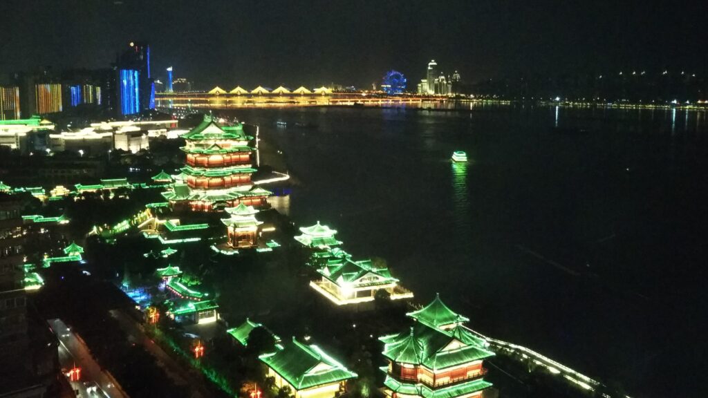 眺望良好ホテル  今回、滕王閣が眺望できる部屋をCtripでネット予約した。ホテル名は「南昌素慈宮巨華江景禅意酒店(Juhua Star Apartment Hotel)。名前がちょっと長いですね。さて、宿に着いたのは夕暮れ時、チェックイン後に部屋に入り、目の前に現れた窓外の風景、電飾された滕王閣は確かにきれいで壮観であった。