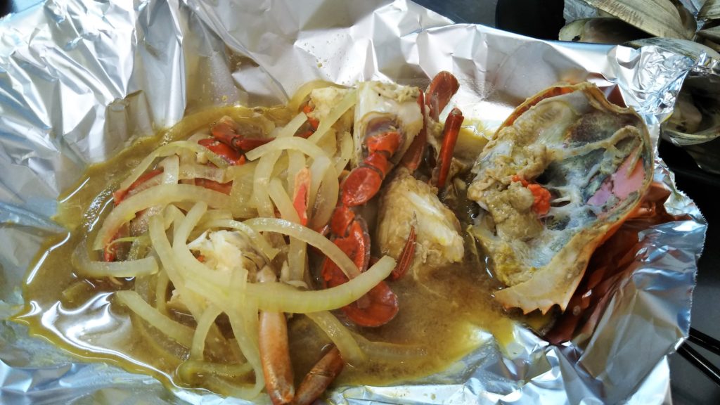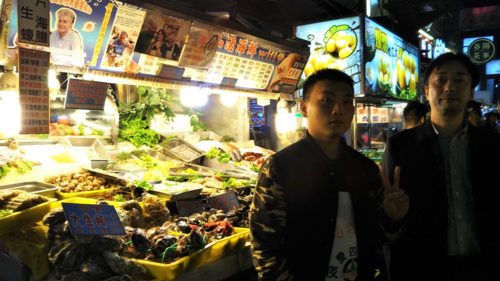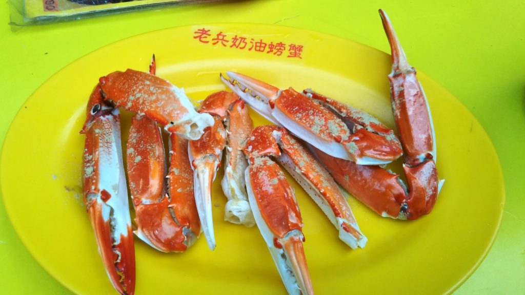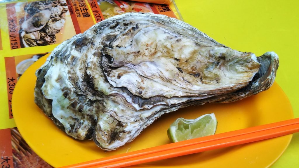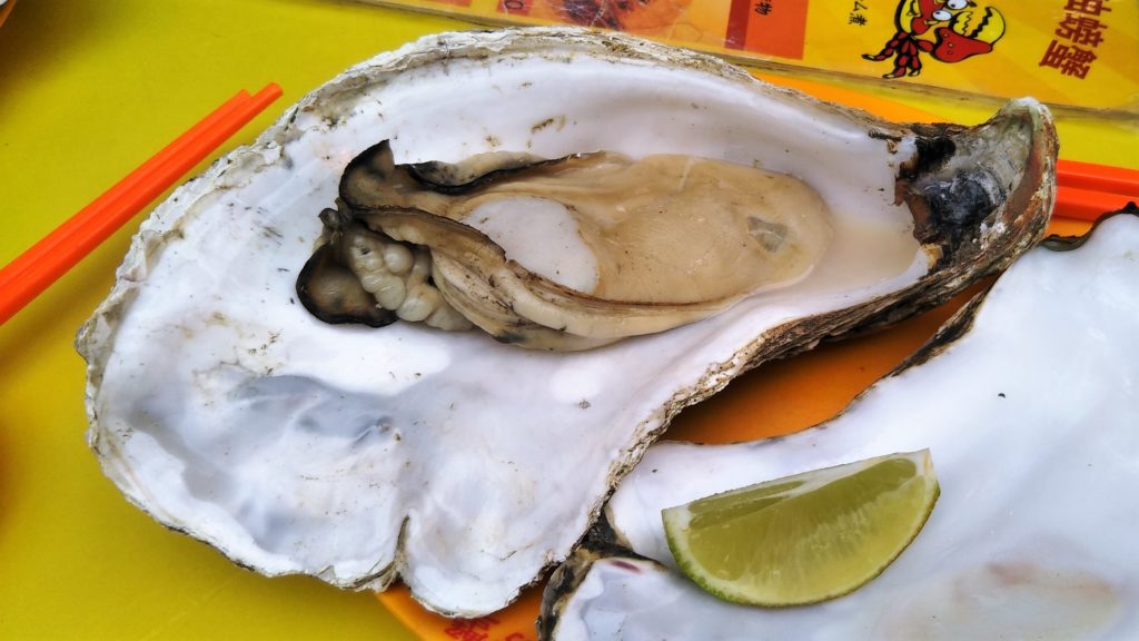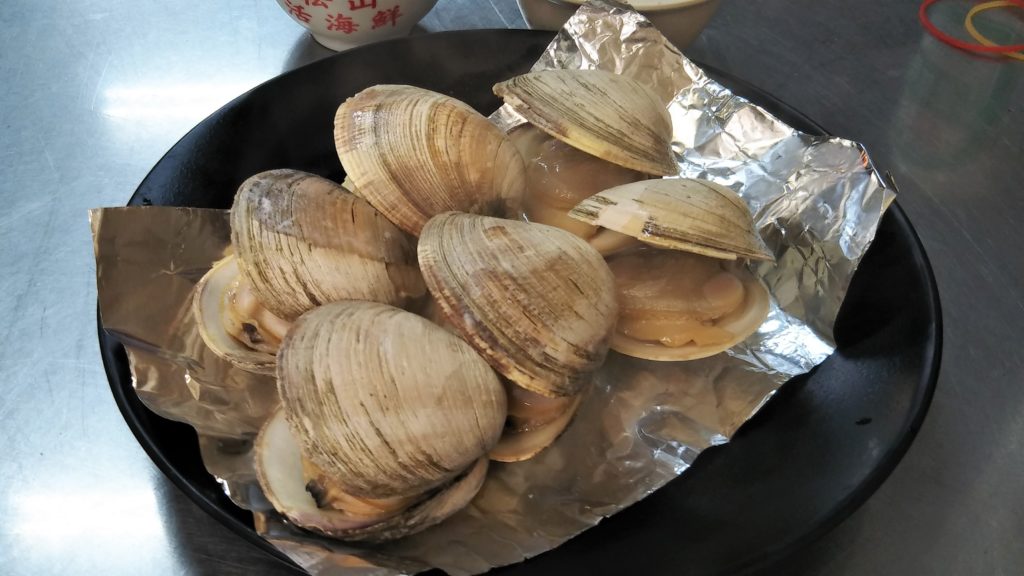 ❷「老兵奶油螃蟹」の焼きカニ脚、焼き牡蠣  カニ脚のほうの印象は消え失せたが、ジャンボ牡蠣の味は今でもよく覚えている。クリーミーで大きいだけあってなかなか食べ応えがあった。ただこの時点で隣の店「松山活海鮮」の存在がかなり気になっていた。並べてある食材が老兵よりも豊富で店構えも本格的な感じがしたからだ。そこで晩は松山へ行くことに決めた。