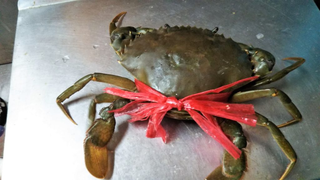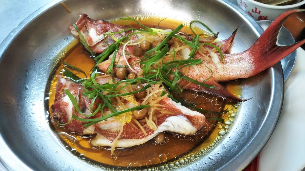 ❸「松山活海鮮」のワタリガニのバター焼き、焼きハマグリ、スジアラの姿蒸し  どれも全ておいしく大満足、この店を選んだのは正解であった。記念に松山の店員さんと記念写真を撮った。次回基隆に来る機会があれば再度ここを訪れたいと思う。
