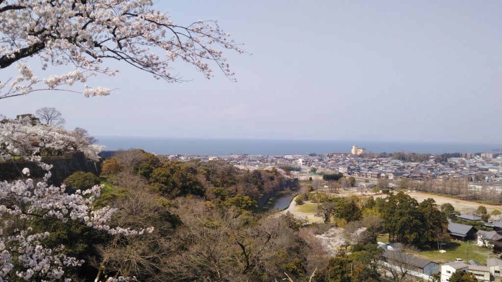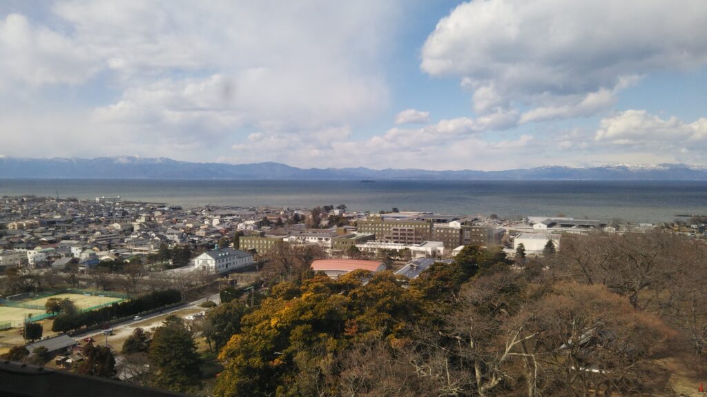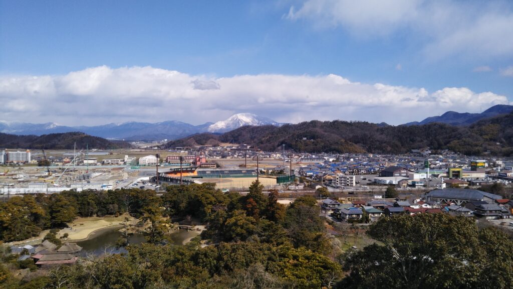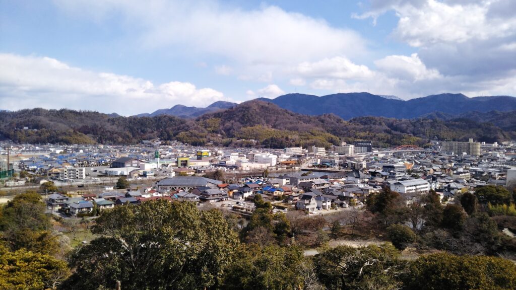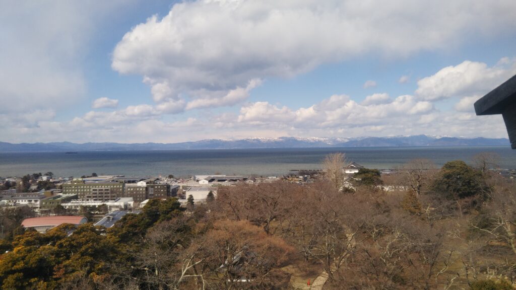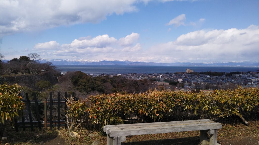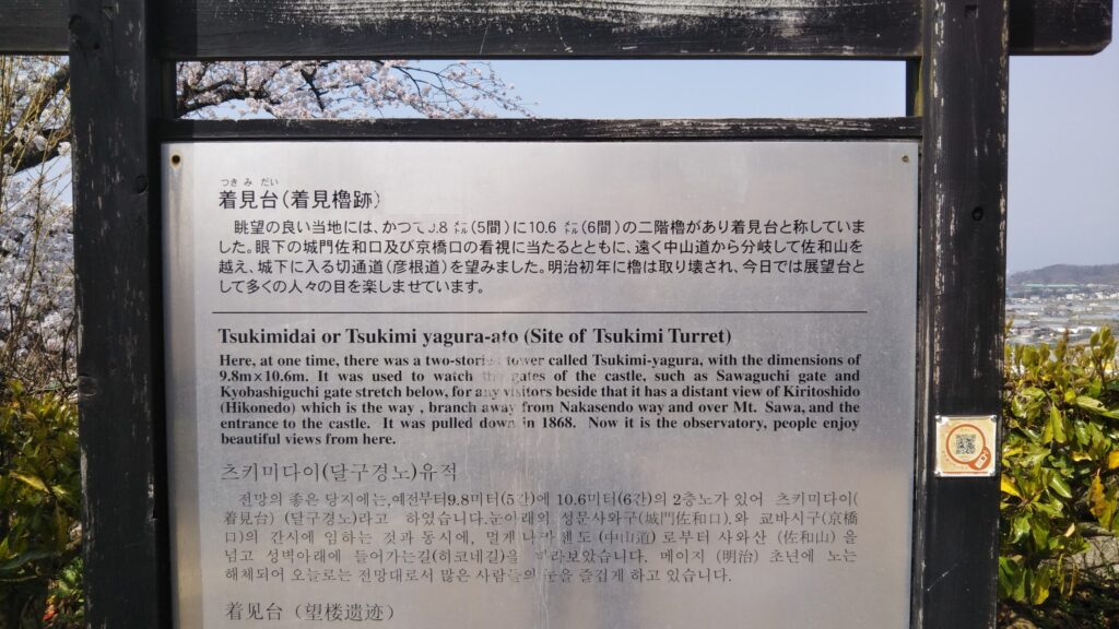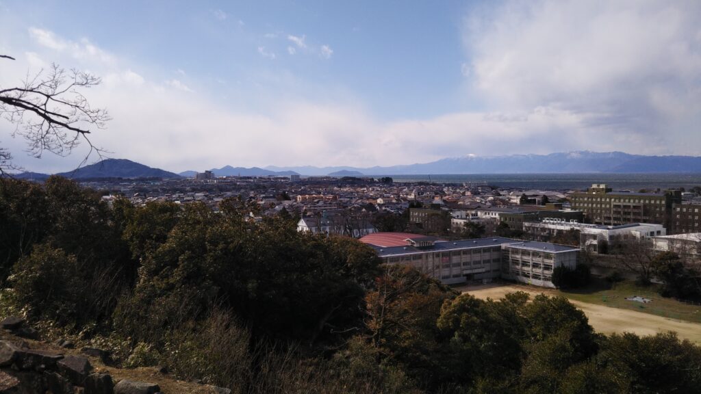 🍀着見台からの眺め 彦根城での眺望スポットはいくつかあるが、一番のお薦めは眺望可能範囲が比較的広い天守近くの「着見台」である。ベンチもあるので座ってのんびり過ごすこともできる。