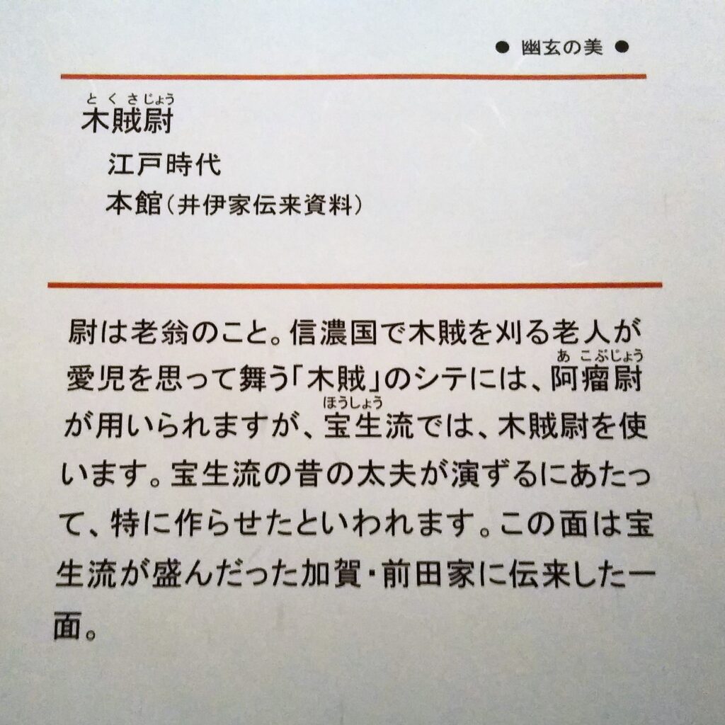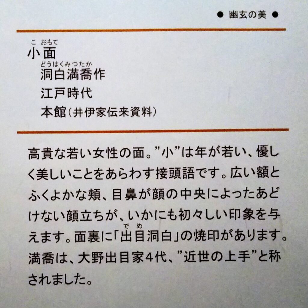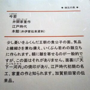 🍀能面 彦根城博物館では能面も存在感を発揮していた。人間の表情は変化に富んでいるが、それを面として一つの表情に固定し形作る作業は楽しいことであろう。ただ同時に、例えば眉間の皺ひとつをとっても、その有無や長さ、深さなど可能性は無限であるが故に多くの取捨選択が迫られ、究極の一品に仕上げようと考えると素人が考えるほど作業は簡単ではないとも思える。さて、普段は特別な事情がない限り他人の表情をじっと見続けることはしないが、能面は何も文句を言わないのでじっくり鑑賞できる。展示テーマは「幽玄の美」であるが、確かに表情の裏に存在する状況を想像するのも楽しいことだ。