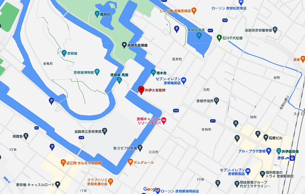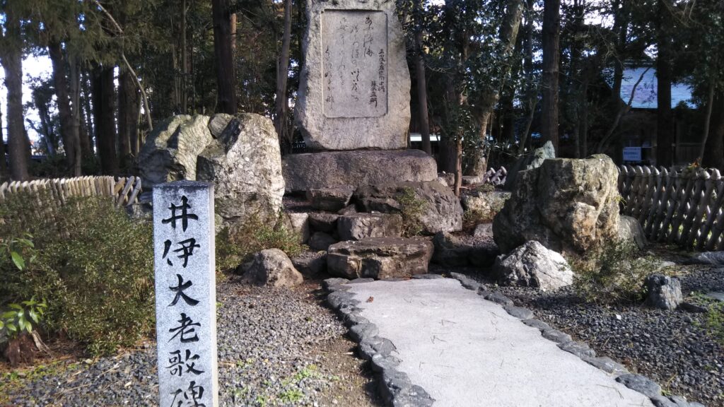 🍀井伊直弼の歌碑 城の佐和田口の手前に歌碑がある。ペリー来航後の変乱期での大老職は「こころをくだく」ことが多く大変だったであろう。その心情を素直に歌にしているところから彼の人となりが少しは伺えるようである。