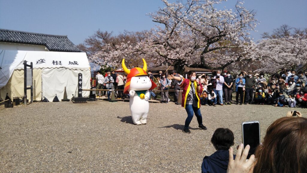 吾人も花見を決行すべく酒を準備し、天守閣と桜が見える絶好のベンチを確保、おひとり様の花見をはじめた。酒をチビチビ飲みながら花や城をのんびりと眺めていた。これは中国で頻繁に行なっていた「園林飲み」のカテゴリーに含まれる。さてしばらくすると、正面に見える天守閣の入口辺りで人々が密集しはじめた。原因は下の画像に示した「ひこにゃん登場(登城?)」である。自分も少し見に行ったがコロナ感染が怖いので、すぐにその場を離れた。このような時期に人々を密集させる主催者は何を考えているのだろうか。今でも疑問である。何してまんねん!?