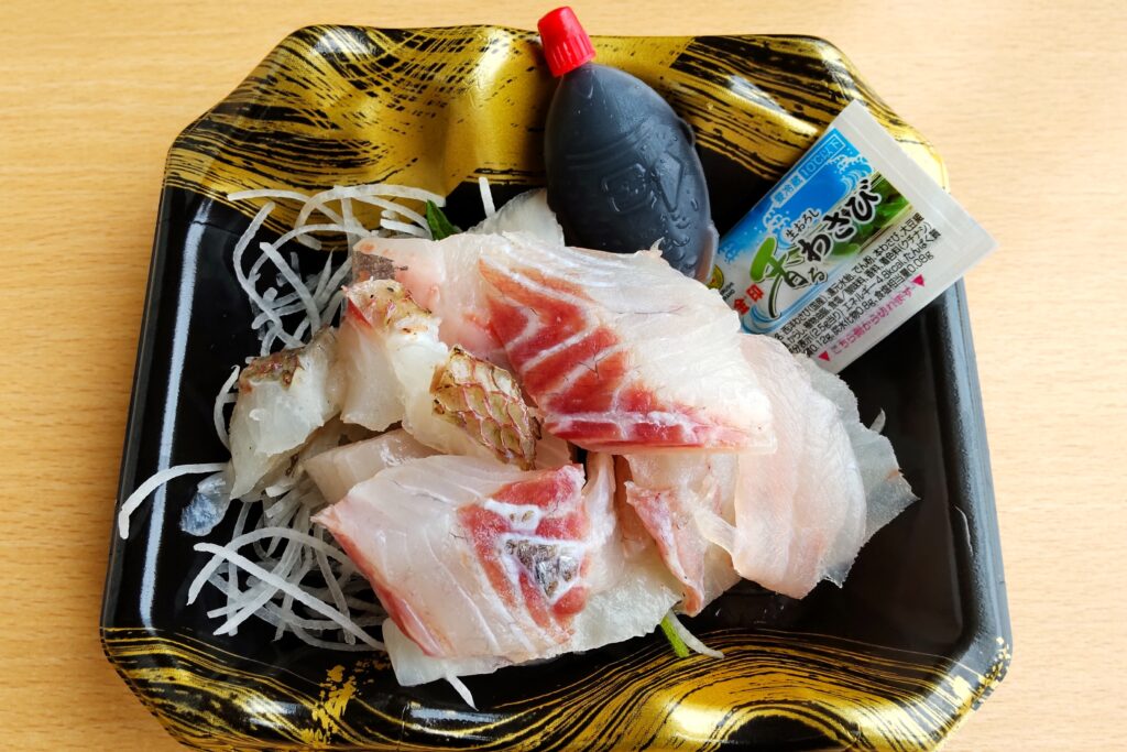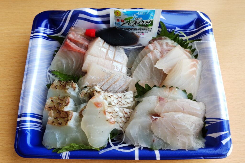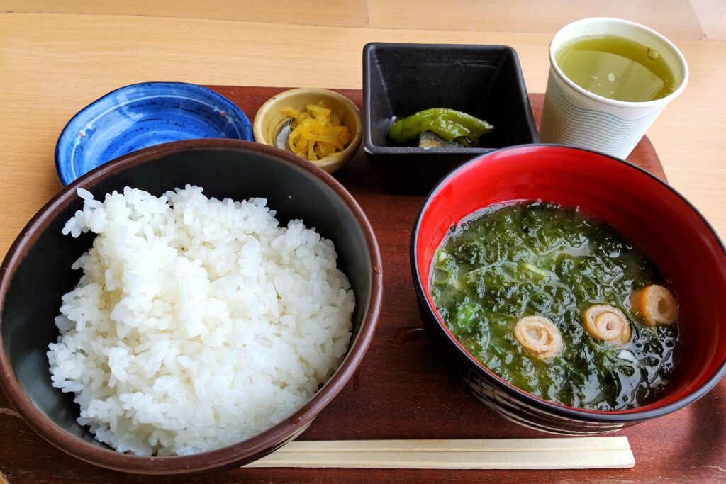 🍀道の駅・うみんぴあ大飯  目的地である鳥居浜海水浴場へ行く途中で昼食をとることにした。建物に入ると正面には若狭湾が広がっていて解放感は抜群だ。フードコートや特産品販売コーナーがあり、野菜などが安く買える。今回は鮮魚コーナーで刺身パックを、フードコートで「ごはんセット(あおさ汁と漬物付き)」を購入、海を眺めながら若狭の鮮魚を堪能できた。OK!おいしさ満足度120%!!