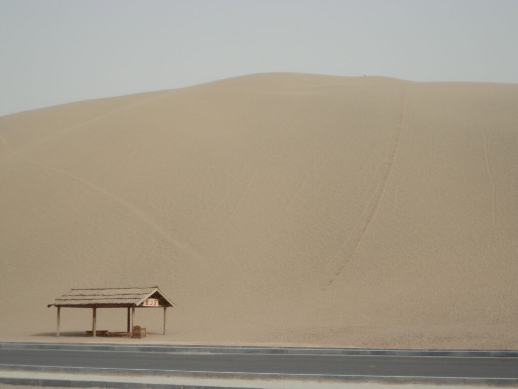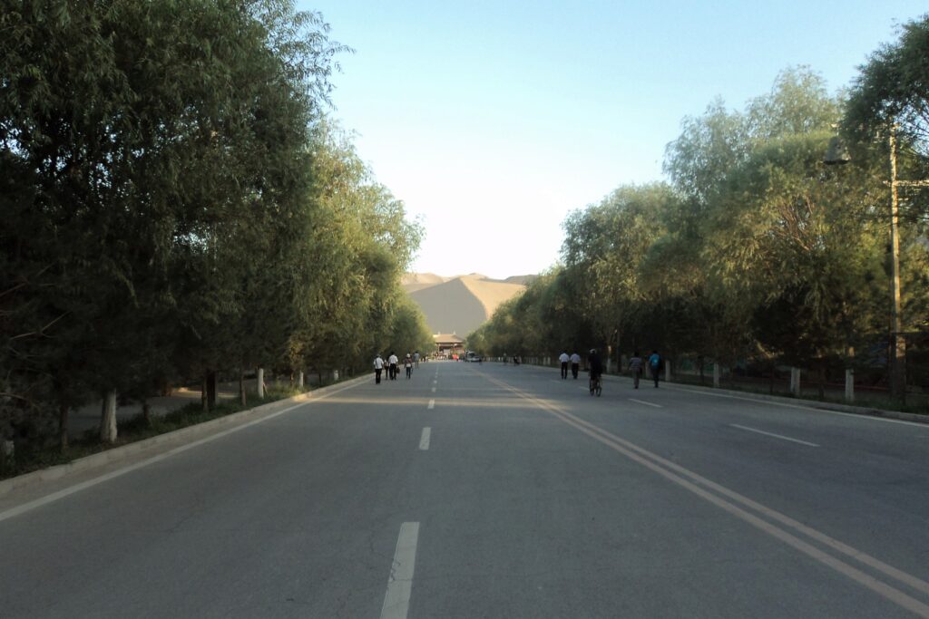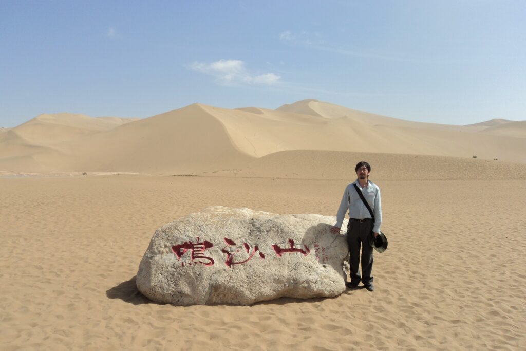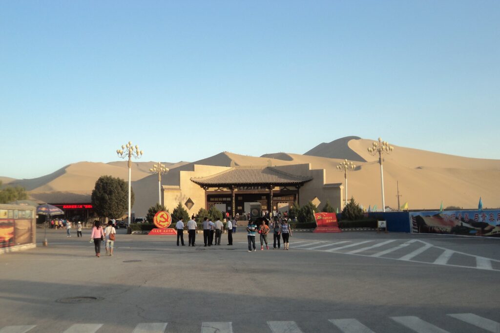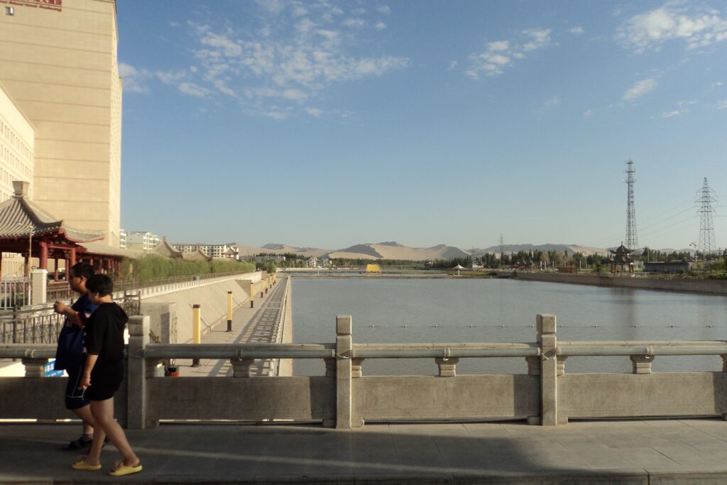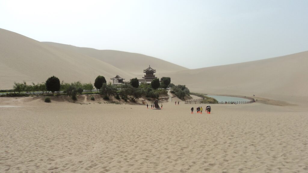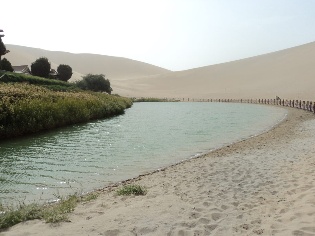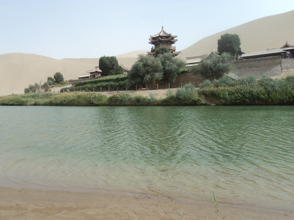 砂漠に来るのは約20年前モロッコのサハラ砂漠以来なので気分が高ぶった。鳴沙山風景区へ続くきれいに舗装された道路を進むと突如巨大な砂山が現れびっくりする。また月牙泉では砂漠の中の一部分にだけ水がたたえているのを見て素直に不思議だと感じた。その後帰国して中国人学生にこの思い出を話すと、一人が「地下に送水管が埋設されている」と言うので意外に感じたが真偽は確認せず、その後はこの話を忘れていた。そして今この記事を書くにあたり気になったので百度で調べてみた。いくつかの説明をまとめると、「月牙泉は低地にあるため長年自然の地下水によって保たれてきたが、1970年代になると開墾や灌漑などが原因で枯渇危機が生じたため、以降は地元政府によって送水を含めた修復工事が行わてきた」ということだ。つまり現在は人工的に維持管理されているわけで、「地下の送水管」を想像すると何だかロマンがなくなるようで寂しい・・・。
