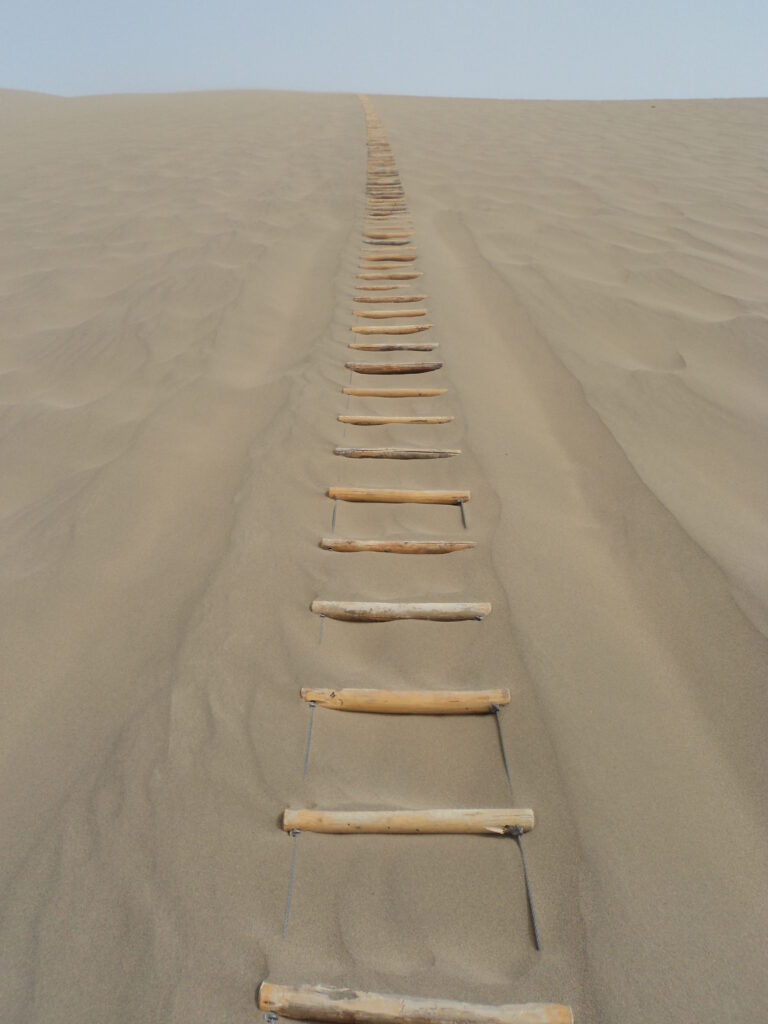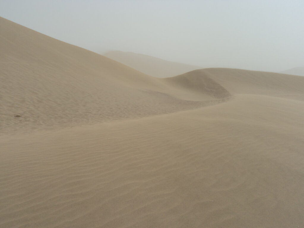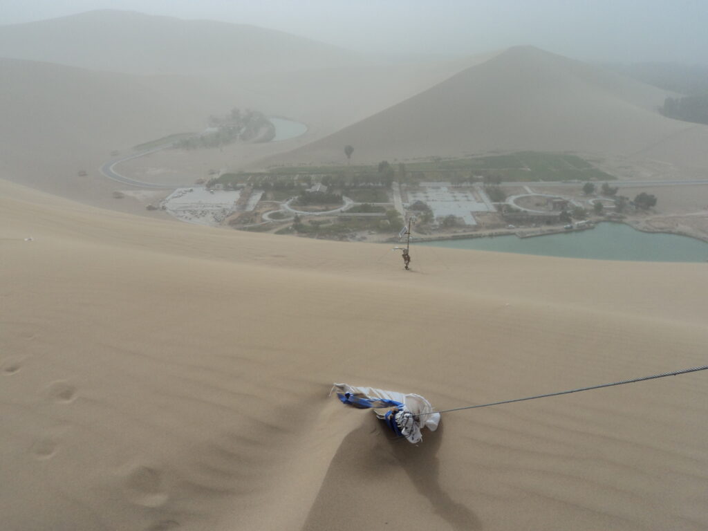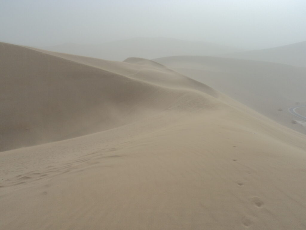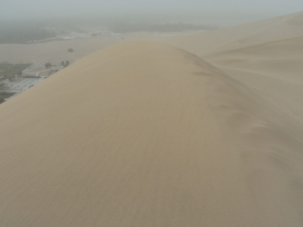 月牙泉の見学を終えると次は楽しい砂山登りだ。観光客が登りやすいように稜線まで縄ばしごが設置されている。さっそうと登り始めたのはいいが普段の運動不足がたたり途中で息が切れる。休みつつ何とか上に到達、ここから稜線を伝って風景区出入口方面へ移動する。私が入場した時は上で掲載した画像にある通り多くの人達が稜線を移動していたが、この時は何故か私一人である。まぁ砂漠の雰囲気を味わうには静かなほうがいいだろう。やがて風が強くなり砂嵐のような状況になった。視界も悪い。風にあおられ谷に転落しないよう注意して進む。舗装された道路側に落ちれば問題ないが、万が一砂丘が連なる側の深い砂底に落ちたら危険である。特に今は周囲に誰もいないので救助されることなく人知れず砂に埋もれて死んでしまうかもしれない・・・。想像すると背筋がヒヤッとする。恐怖だ😨・・・。やはり単独行動のデメリットはこの点にあると痛感する。その後安全な場所に到着したときはホッとした。今回はスリルも味わえたので高い入場料も十分納得である。