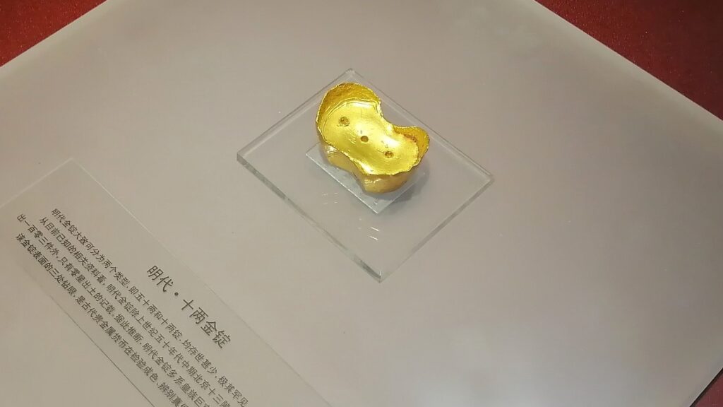 中国歴代の金貨  金貨はたとえ戦国時代のように大昔の物であっても新品のようにピカピカ輝いている。まるでタイムスリップして現在に届けられたかのようだ。それこそがゴールドの価値なのであり、大昔から人々を魅了し続けている大きな理由であろう。歴代金貨はとても珍しいのでガラスケースにへばりついてまじまじと眺めていた。