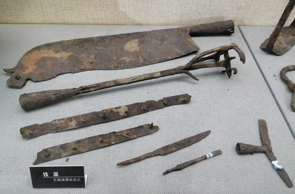 五国頭城遺跡からの出土品  遺跡からは金代の鉄器や銅鏡が多く発掘されたという。鉄器は武器の他に農具や生活用具が多く展示されていた。当時は鉄器の使用が一般的だったということだろう。