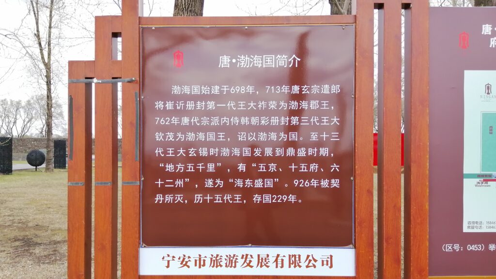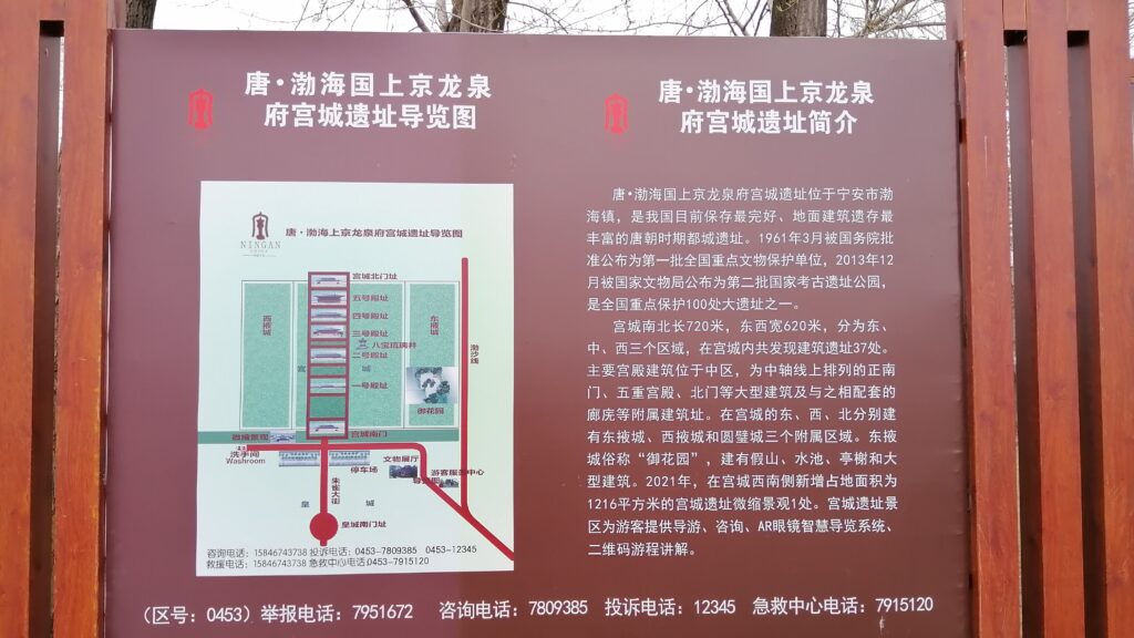 【三日目】渤海国上京龍泉府遺跡  この日はホテルのご主人に僅かだが謝礼を渡して車を出してもらい、遺跡と少し遠方の鏡泊湖に行くことになった。自宅のある高島市でもそうだが、バスが極端に少ない地方の小さい町では自家用車があると非常に便利である。遺跡は広く自分の場合は一通り見て回るのに約1.5時間かかった。現地は礎石や石垣などの遺構があるだけで建物は残っていないが、縮小復元模型などを参考に当時の様子を想像しながら散策するのは面白い。以下では多くの画像を掲載したが見れば何か理解できるので説明は最小限にとどめる。