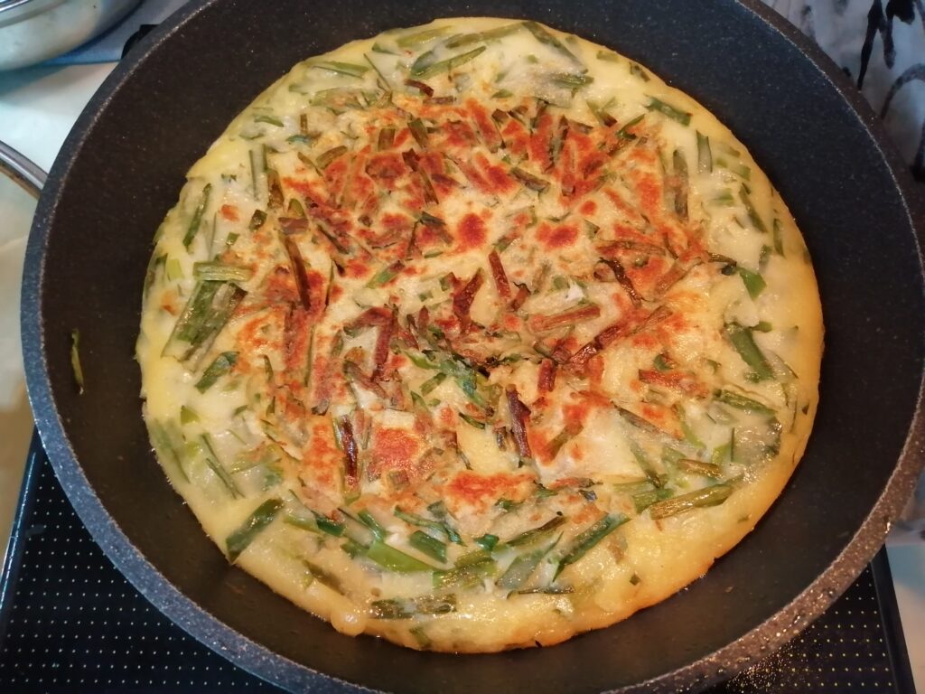 薄焼き生活  一時帰国前にもらった大袋の小麦粉、これを食べ尽くすのが現在の課題である。そこで最近の夕食は調理が簡単な「薄焼き」を作って食べている。作り方は「小麦粉に水・卵・ネギorニラを入れ混ぜてからフライパンで焼く」だけ。タレは何でもいいが、自分の好みは「醤油・酢・ゴマ油・一味唐辛子」を混ぜた液体。時々味を変えたい時は、買い置きしてある「ケチャップorマヨネーズ」を使う。手軽でおいしい薄焼き、オススメです~。