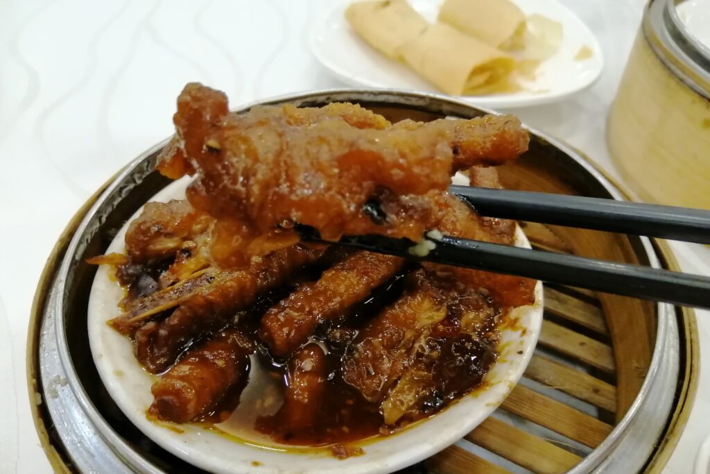 先ずお茶は晋洱(プーアル茶)を注文。テーブルには既にお湯が入った急須があったので、それで食器を洗う。一般的には一杯目の茶を使うが、まぁ問題ないだろう。そして適度な頻度でテーブルの横を点心を載せたワゴンが通るので、中身を見て食べたい物があれば注文する。今回は春巻、ウズラ卵をのせた焼売、鼓汁鳳爪(鶏脚の豆鼓ソース蒸し)、そして定番の鮮蝦餃(エビ蒸し餃子)を選んだ。特に豆鼓の旨味がしみ込んだコラーゲンたっぷりの鶏の脚、そしてプリプリ新鮮なエビ餃子が実においしかった。もっと他の種類の点心も食べたい気持ちはあったが、一人では以上の四品で満腹、ゲームオーバー。さてさて香港での初の単独飲茶は大成功であった!