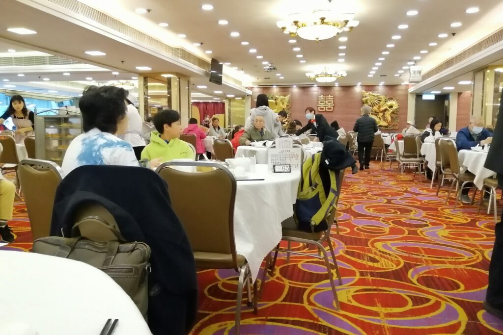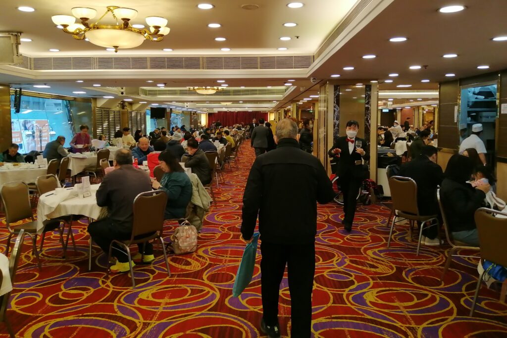 宿の最寄り駅「尖沙咀」から三駅目の「旺角(モンコック)」で下車、徒歩で飲茶が人気の「倫敦大酒店(ロンドンレストラン)」へ向かう。エレベーターで食事フロアに上がるとかなり広いスペースに多くの人たちがにぎやかに食事を楽しんでいる。その時は完全に空いたテーブルはなかったので相席した。
