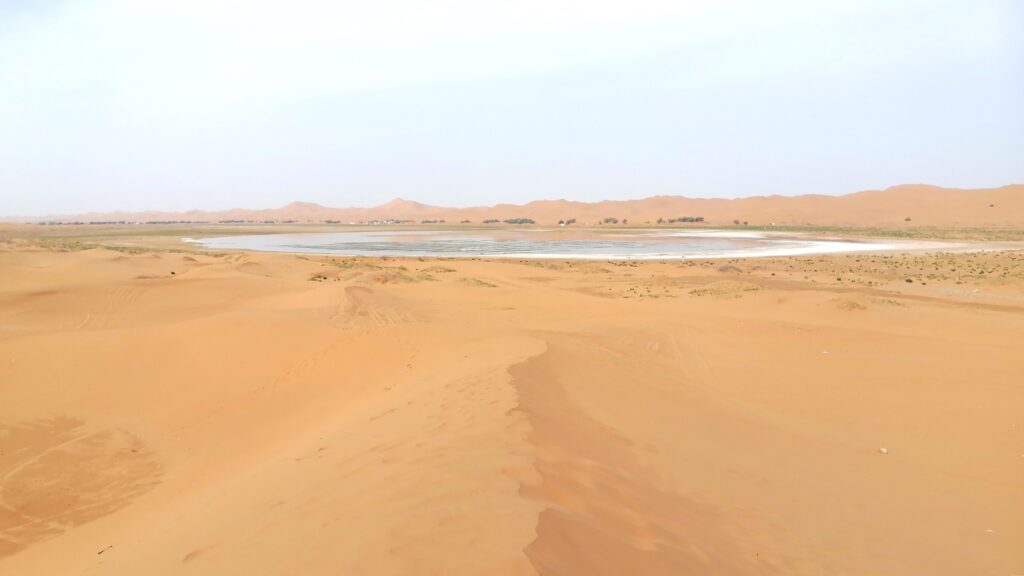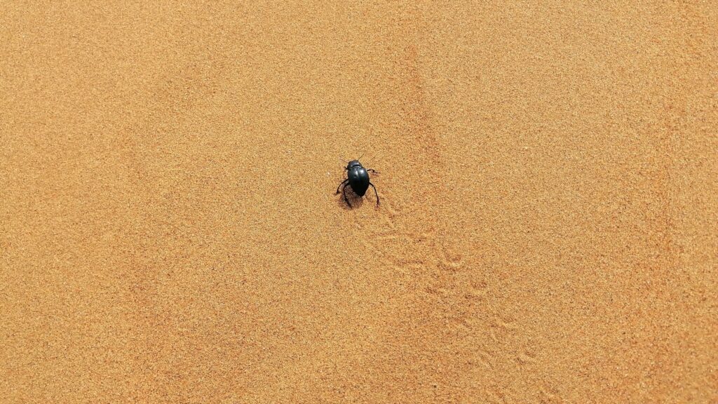 阿拉善英雄会夢想公園  ホテルを出発してから約1時間、今回観光する最初の砂丘エリアに到着。ここは「阿拉善英雄会」のメイン会場で、スタジアムや宿舎など様々な施設がある。ただ開催期間以外は訪れる人は少ないのか、四駆車が多少確認できるだけだ。タクシーを降り、砂で半分埋もれた門を乗り越えて砂丘エリアに入る。このエリアは四駆車の専用コースなのか、広い範囲で多くのタイヤ痕が残り、砂丘本来の美観が損なわれていたのが残念であった。それでも手前にある小ぶりな砂丘に登ってみた。砂山に登るのは久しぶりで、前回は確か2012年、当ブログのトップ写真にも使っている敦煌の鳴沙山だったと思う。登り始めると靴が砂に埋もれて歩きにくいが、何とか上部の稜線までたどり着く。頂からの眺めは良く、少し離れた位置にある池もきれいに見える。そして砂丘の下に紫色の物体が見えたので確認しに下りる。名前は分からないが紫色のきれいな花だ。最初は気づかなかったがこのエリアにはこの花が数多く咲いていた。砂に埋もれた花植物、何とも不思議な光景である。その他、黄色い花や甲虫も確認した。このエリアには池もあり、前の晩は雨も降ったようなので、時季による違いはあるだろうが、生物が比較的生息しやすい環境なのかもしれない。