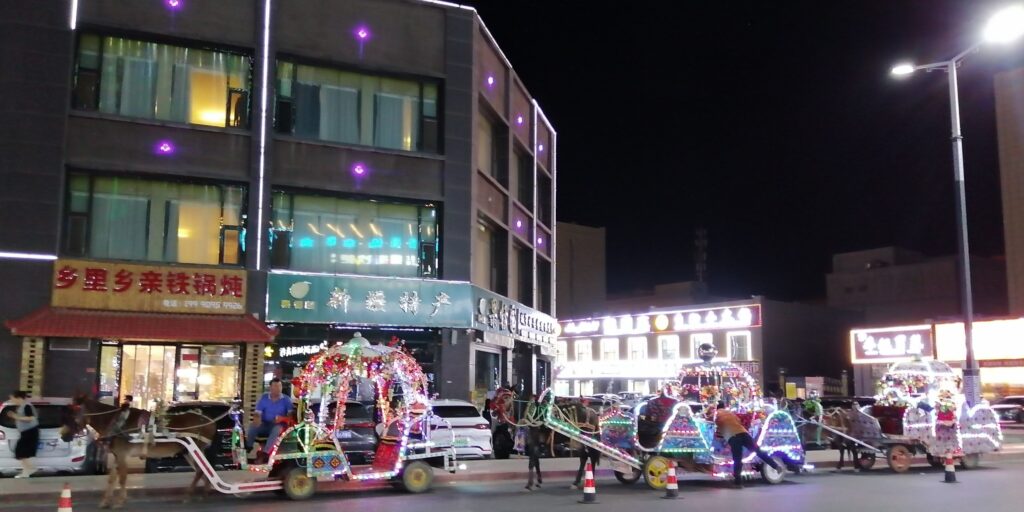 夜、ホテル周辺を少し歩いて回る。街は昼間よりも人出が多く賑やかだ。日中は暑いので極力外出せず、日が落ちてから外に出て楽しむということだろう。そして夕食を買うためホテル近くの食堂に入る。「葱爆羊肉蓋澆麺」(長ネギと羊肉の炒め物かけ麺)をテイクアウトし部屋に戻って食べる。飲む酒は昼間も少し飲んだ焼酎「白糧液」。麺料理はネギと羊肉が旨辛く炒められ、麺を絡めずそのまま食べても美味しい。数口食した後は、喉に付いた油分を42度のキリッとしたトルファン焼酎で洗い流す。プハ~、う~ん、至福のひと時・・・。