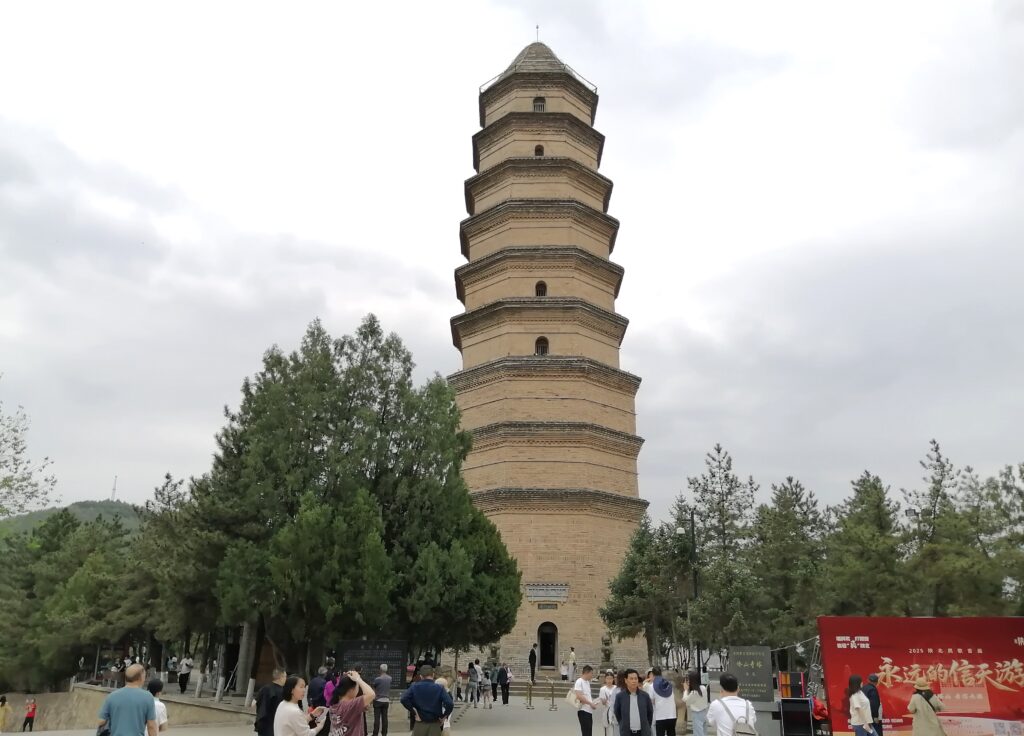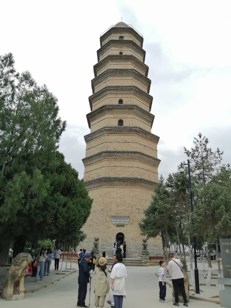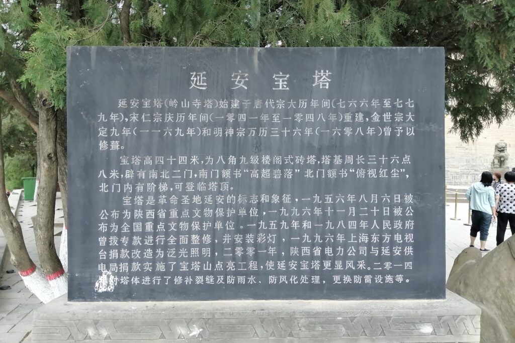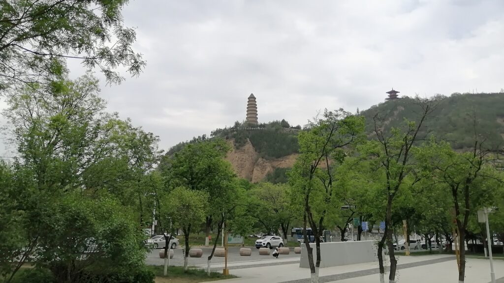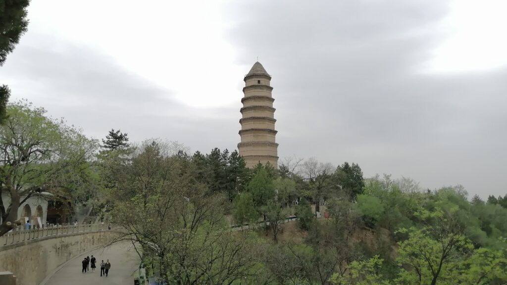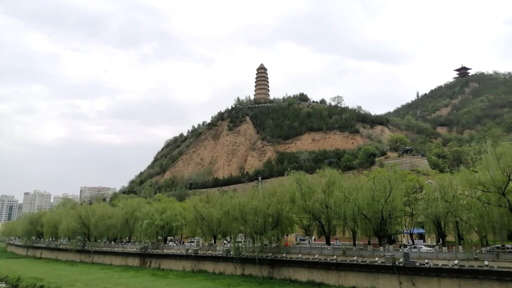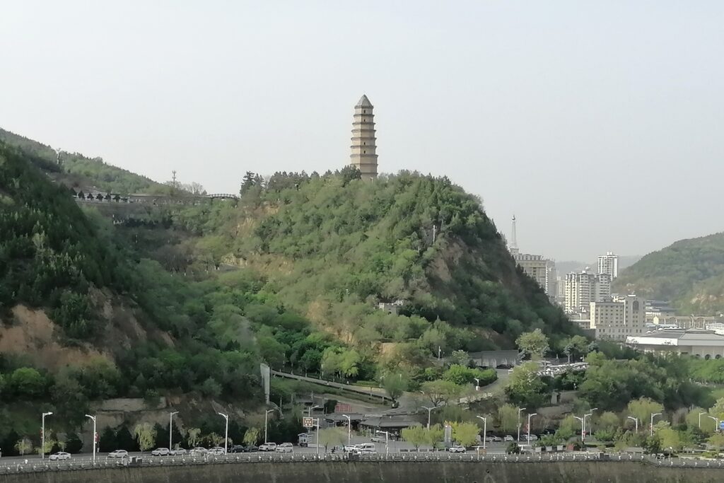 宝塔  観光センターから20分ほどで宝塔の下に至る。宝塔は革命聖地・延安のシンボル。間近で見てもなかなか立派な塔だ。有名な歌曲「延安頌」(1938)の最初の部分にもこの塔が登場する。
