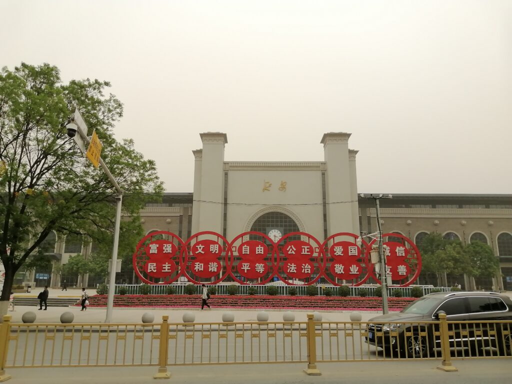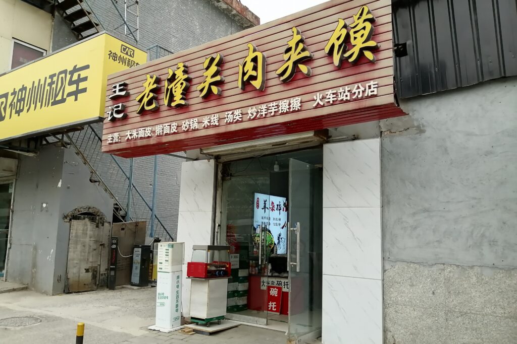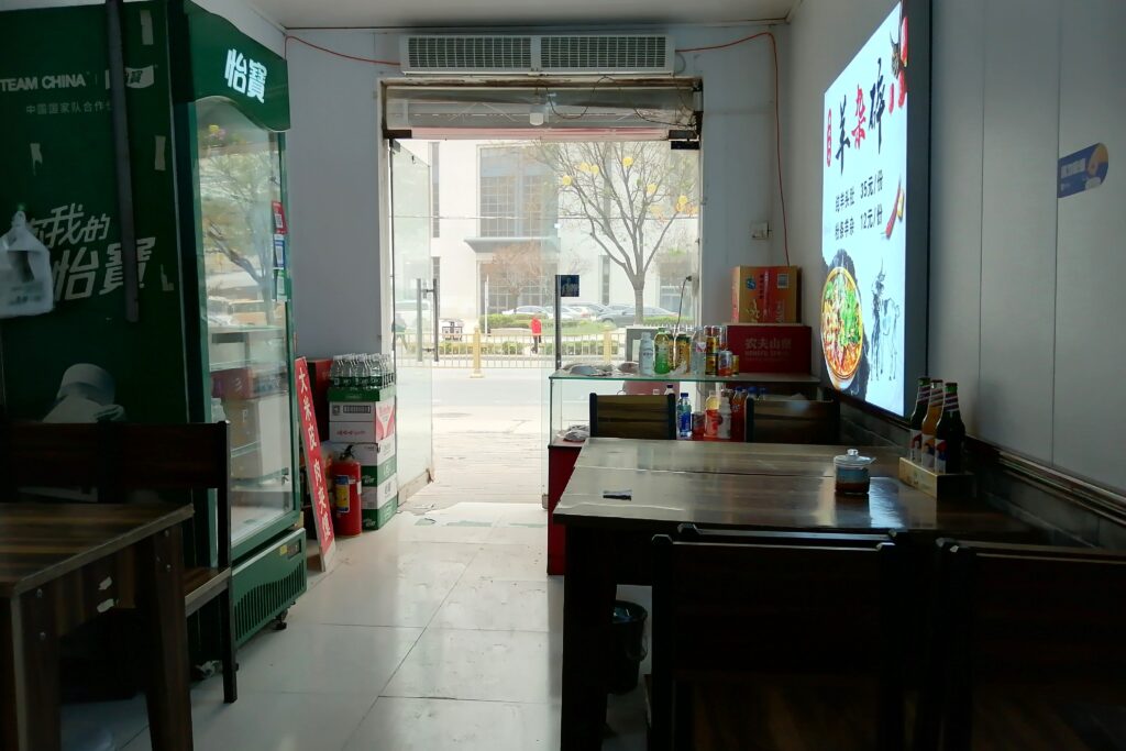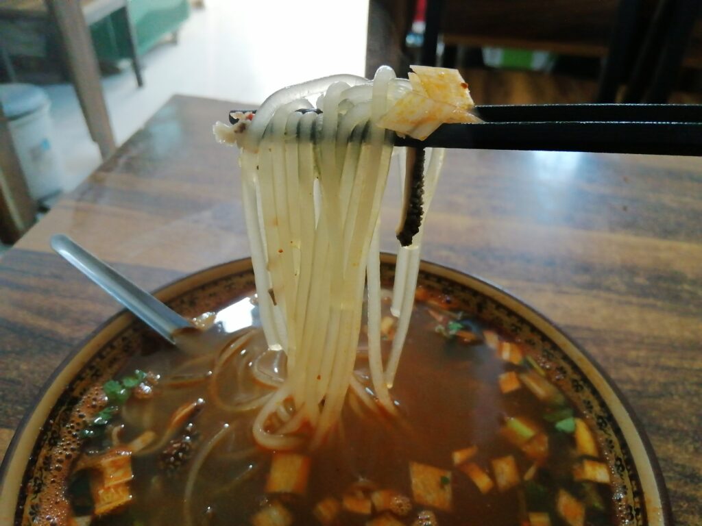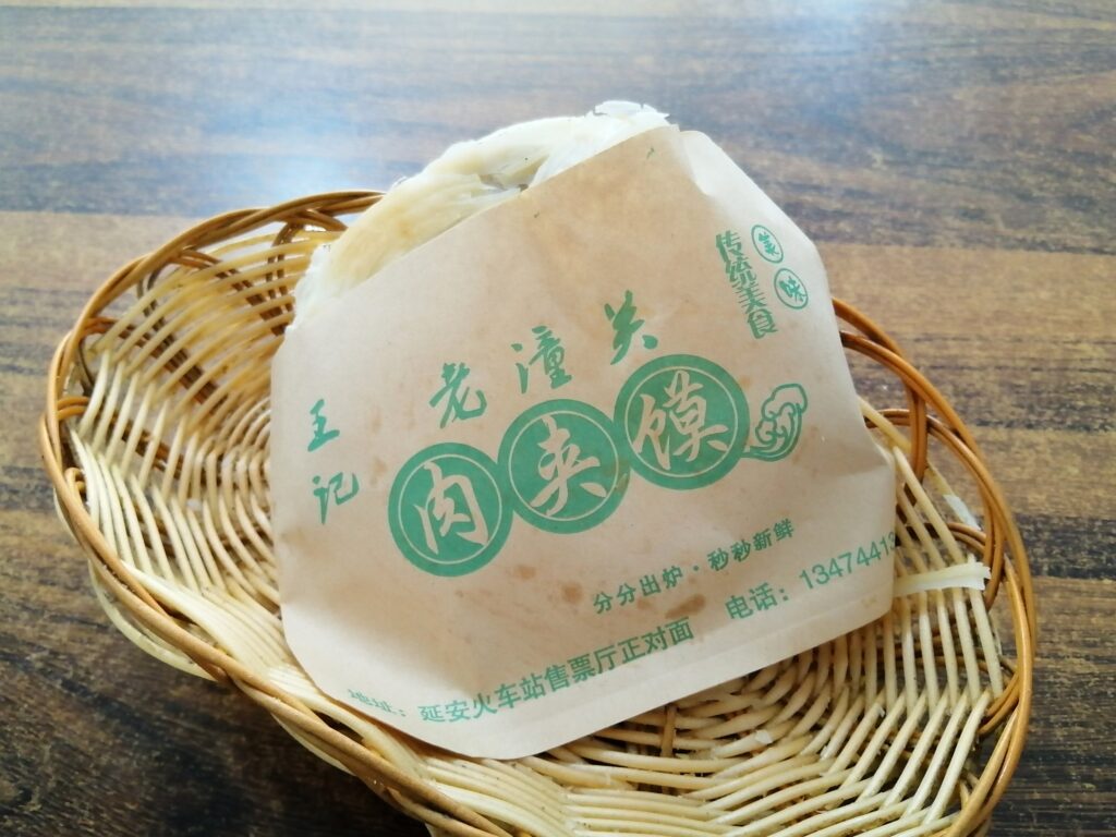 延安駅前で食事  宝塔見学も終了。山を下り市バスで駅へ向かう。この頃、風が強く黄砂が巻きあがり、空も黄色くなる。運悪く哈爾濱から持参した透明サングラスが壊れゴミ箱に捨てたので、砂が目に入りイガイガする。まぁこういう地方なので仕方ないか・・・。時刻は午後3時半。列車出発まで2時間ある。少しお腹も空いたので駅前の食堂で軽く食事。ここでは中国バーガー「肥痩肉夾饃」とスープ麺「粉条羊雑」を注文。ツルッとした透明な「粉条」(はるさめ)、お店に人によると原料は緑豆とのこと。この二品でお腹もふくれる。