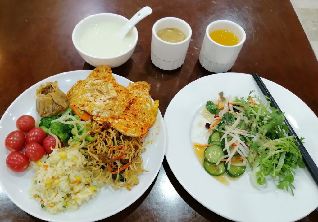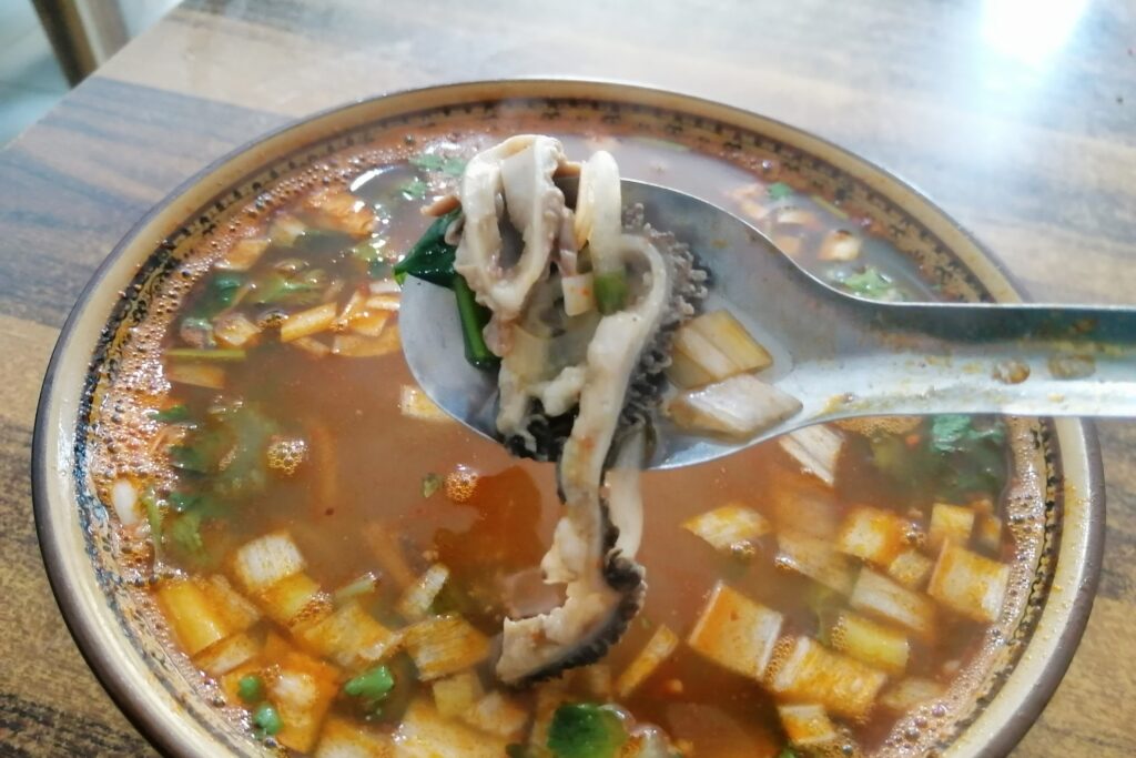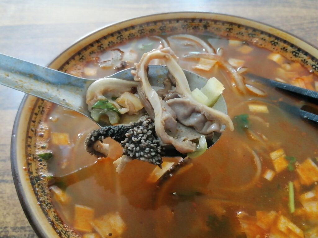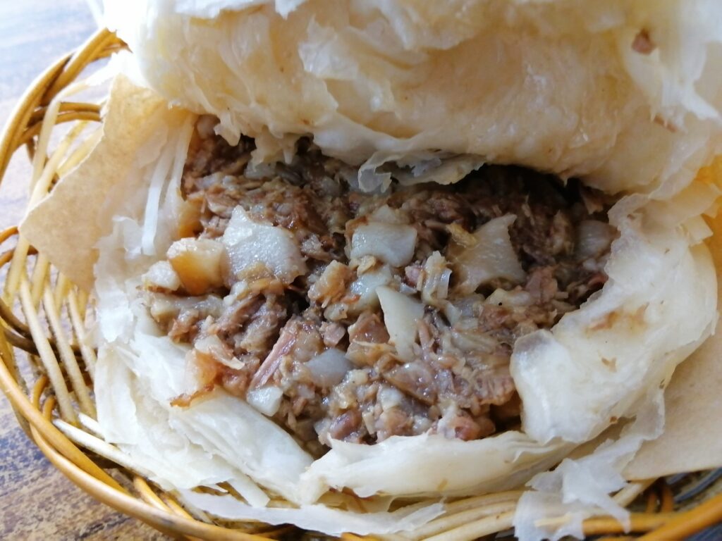 延安駅前で食事  宝塔見学も終了。山を下り市バスで駅へ向かう。この頃、風が強く黄砂が巻きあがり、空も黄色くなる。運悪く哈爾濱から持参した透明サングラスが壊れゴミ箱に捨てたので、砂が目に入りイガイガする。まぁこういう地方なので仕方ないか・・・。時刻は午後3時半。列車出発まで2時間ある。少しお腹も空いたので駅前の食堂で軽く食事。ここでは中国バーガー「肥痩肉夾饃」とスープ麺「粉条羊雑」を注文。ツルッとした透明な「粉条」(はるさめ)、お店に人によると原料は緑豆とのこと。この二品でお腹もふくれる。