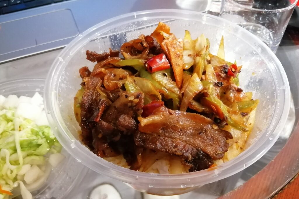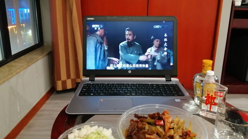 酒は地元焼酎「老楡林」の小瓶、「小郎酒」と一緒に買う。食べ物も近くの店で「回鍋肉蓋澆飯」(ホイコーロ・ライス)をテイクアウト。部屋に戻り、風呂に入ってスッキリしたら晩酌タイムのスタート。