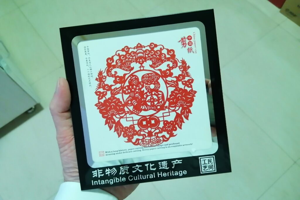 9時にホテルの朝食をとり、部屋で少し休んでから外出する。チェックアウトの際、ホテルスタッフから中国の伝統民間工芸品「剪紙(切り絵)」をプレゼントされた。赤紙に福の字と各種模様が精巧に刻まれ、なかなかきれいだ。小型額なのでどこにでも飾れるのが良い。こころ温まる贈り物、ありがとうございました。その後はホテル前から市バスに乗り「棗園」へ向かう。