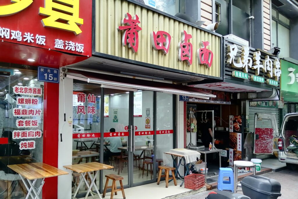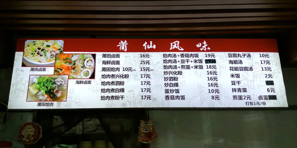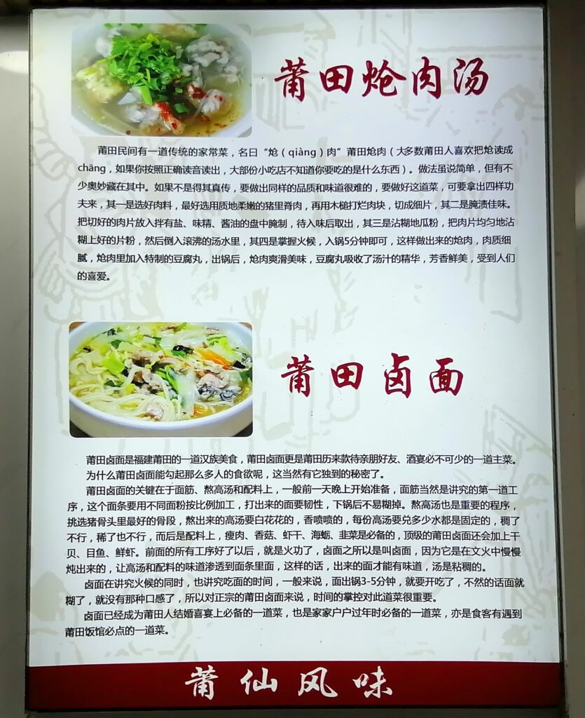 莆田滷麺 市内のに戻ると早めの夕食として福建名物「莆田滷麺」を食べる。莆田とは福建省にある地名。滷麺とはトロミスープ麺。店内の説明文によると調理法、麺、スープ、具材等にコダワリがあるという。例えば具材では、豚赤身肉、シイタケ、干しエビ、蛎、ニラは必須。より詳しい説明は百度百科から引用する。