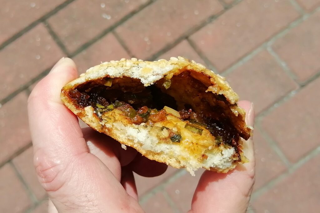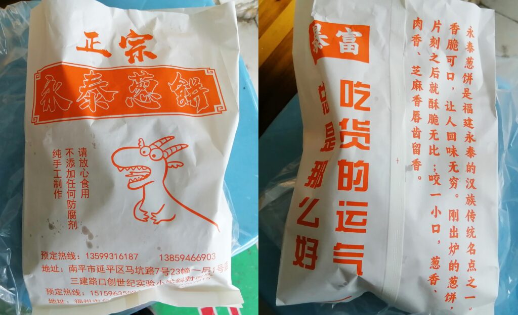 さてこの葱餅、表面はバリッとして硬く、具は甘辛い味付け。値段は画像の通り6個10元。これから閔安観光、途中で小腹が空いた時用にちょうどよい。永泰葱餅の説明は百度百科より引用する。