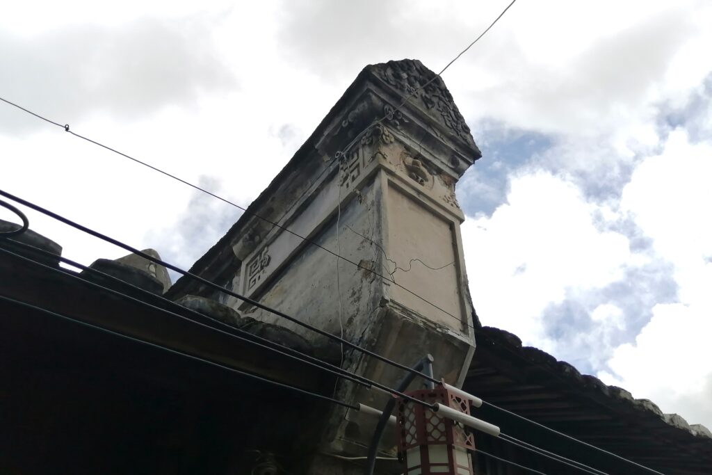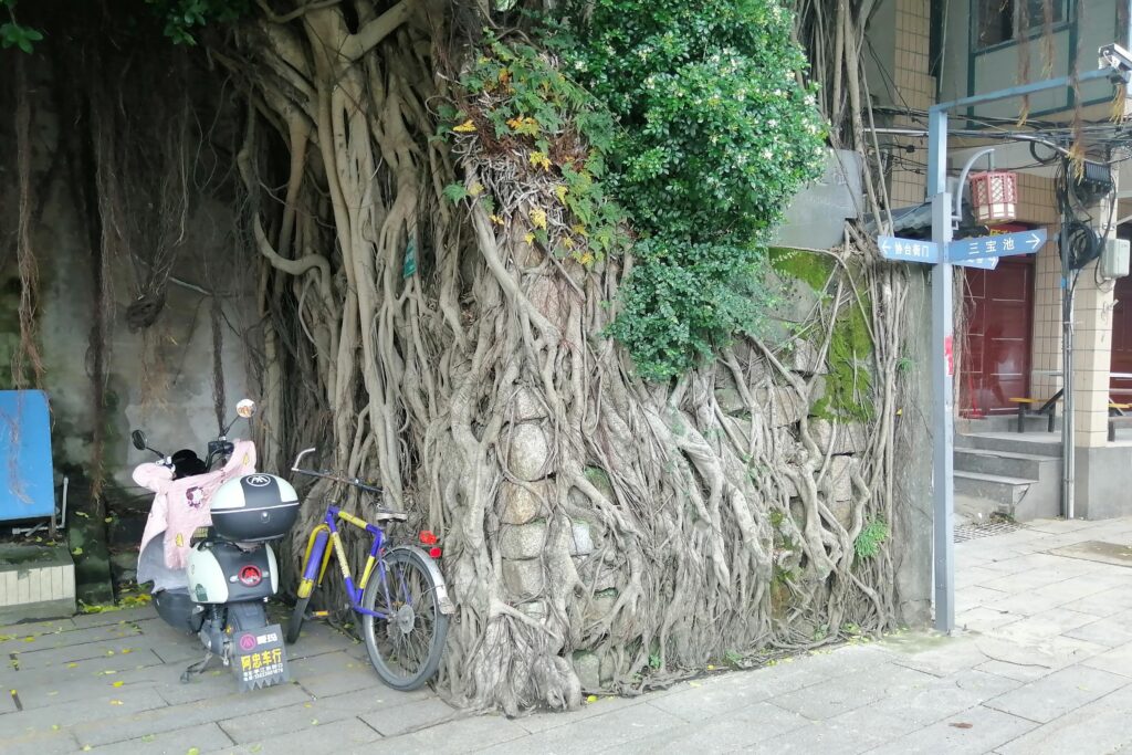 衙門の見学後は、古鎮内の奥へ進む。衙門入口のすぐ北側に、古い城壁の一部が残っている。マングローブの根でガッチリ覆われている。もし壁の崩壊防止に役立っているのなら、緑化推進と文化財保護の一挙両得と言えよう・・・。歩き進めると、保護対象の歴史的建築物をいくつか見ることができる。