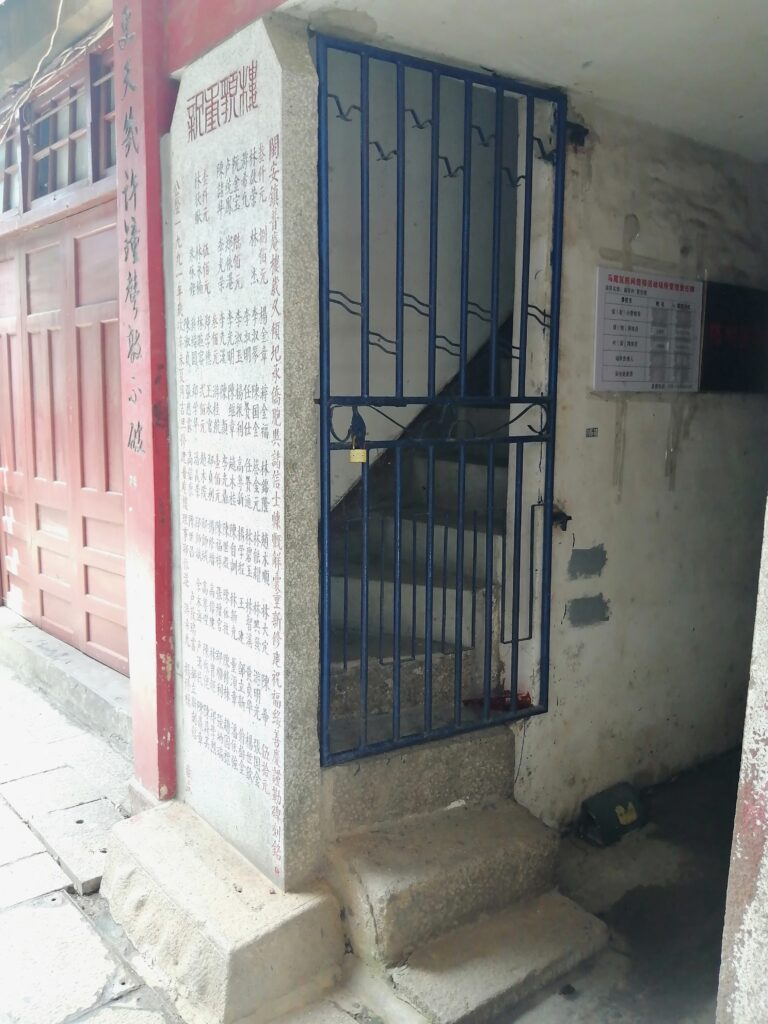 普庵楼 まもなく渡り廊下のような建物が現れる。下に百度百科から引用する。それによると、陳明良という人物が馬江海戦で上陸したフランス軍に殺害された。後に人々が彼を記念して殺害地点に普庵楼を建てたということだ。楼に登る階段は見えるが、見学当時は閉鎖されていていた。