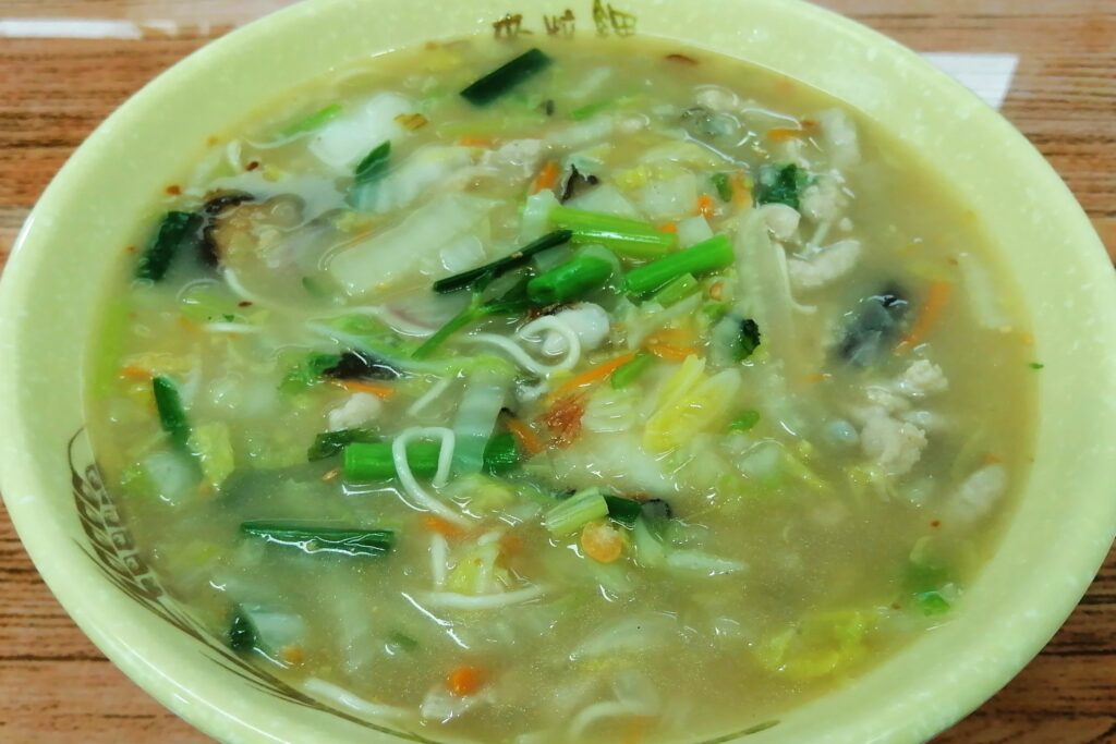 さて箸を使って食べようとすると、麺のひと塊がボサッとつまみあがる。なに~!? その姿は麺とは別の食材のようだ。口に入れるとモサモサ・ボサボサして歯ごたえは無く、妙に柔らかい。まるでオカラ(卯の花)か離乳食のような食感。そうか、わかった・・・。残念ながら私の好みではない。ただ消化は良いはず。腹の調子が悪い時は興化米粉入りスープはオススメだ。