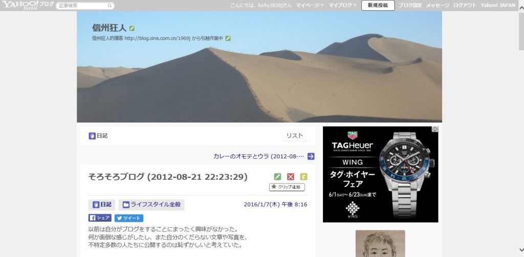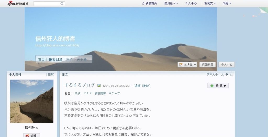 しばらく使っていると、どんなものでも愛着がわいてくる。「信州狂人ブログ」は、私が寧波市にいた2012年に新浪博客(シナブログ)を利用して開始した。2013年の帰国後もシナブログを使用していたが、画像が一部表示されないという不具合が生じた。中国ブログサービスに対する信頼性への不安から、2016年に日本のヤフーブログの併用を始めたのだ。