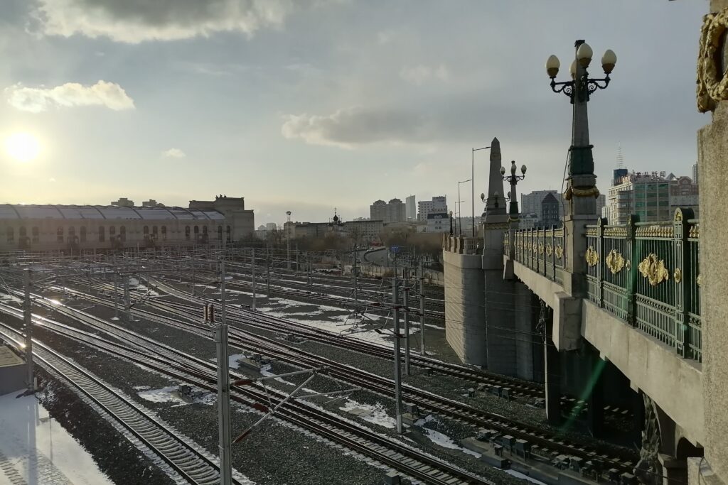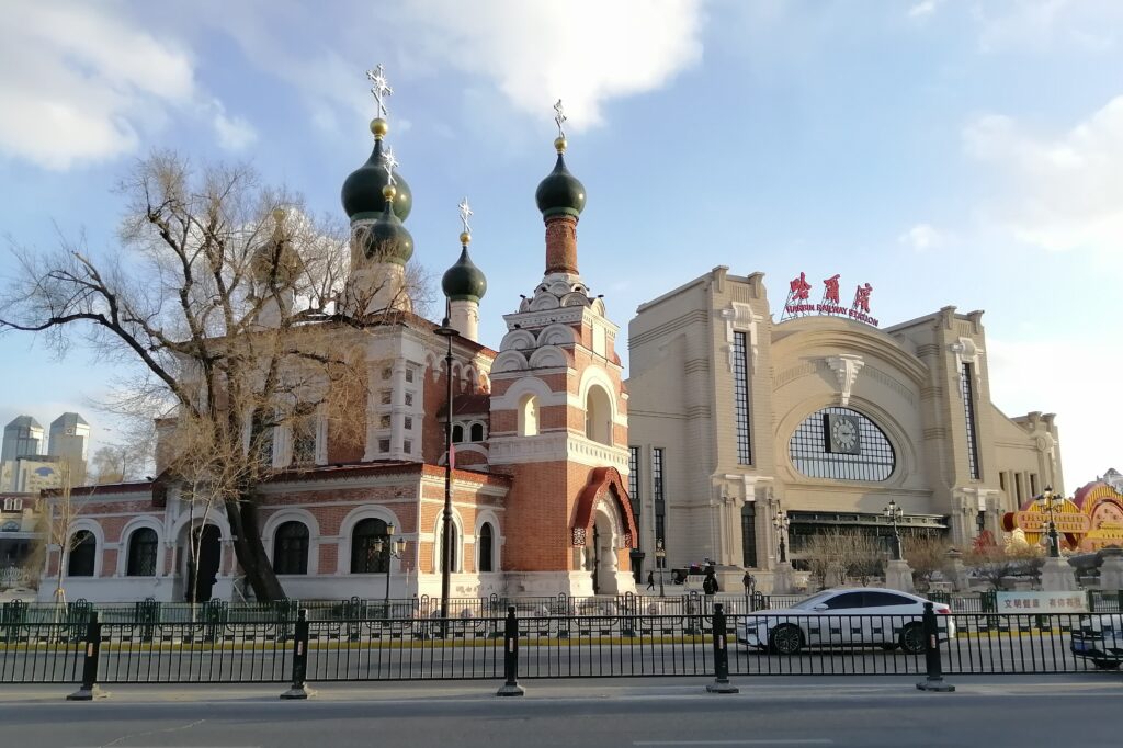 さてさて、1万歩はすでに達成したのでそろそろ帰宅しよう。線路をまたぐ橋を通って帰る。下には何本もの路線が見える。過去から現在、そしてこれからも多くの人たち様々な思いをこれらの線路はつないでゆく・・・。橋を渡りしばらく行くと哈爾濱駅の北広場に至る。そこには「聖イヴェロン教会」(中文:圣·伊维尔教堂。1908年建設)が見える。ネットで調べると文革ではタマネギ屋根も破壊され長らく倉庫として利用されボロボロの状態だったという。今はきれいに修復された。次回またゆっくりと見学しよう・・・