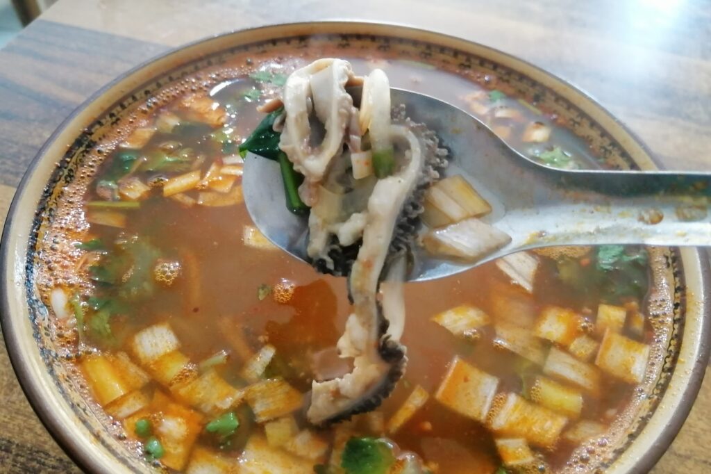 延安駅前で食事 宝塔見学も終了。山を下り市バスで駅へ向かう。この頃、風が強く黄砂が巻きあがり、空も黄色くなる。運悪く哈爾濱から持参した透明サングラスが壊れゴミ箱に捨てたので、砂が目に入りイガイガする。まぁこういう地方なので仕方ないか・・・。時刻は午後3時半。列車出発まで2時間ある。少しお腹も空いたので駅前の食堂で軽く食事。ここでは中国バーガー「肥痩肉夾饃」とスープ麺「粉条羊雑」を注文。ツルッとした透明な「粉条」(はるさめ)、お店に人によると原料は緑豆とのこと。この二品でお腹もふくれる。