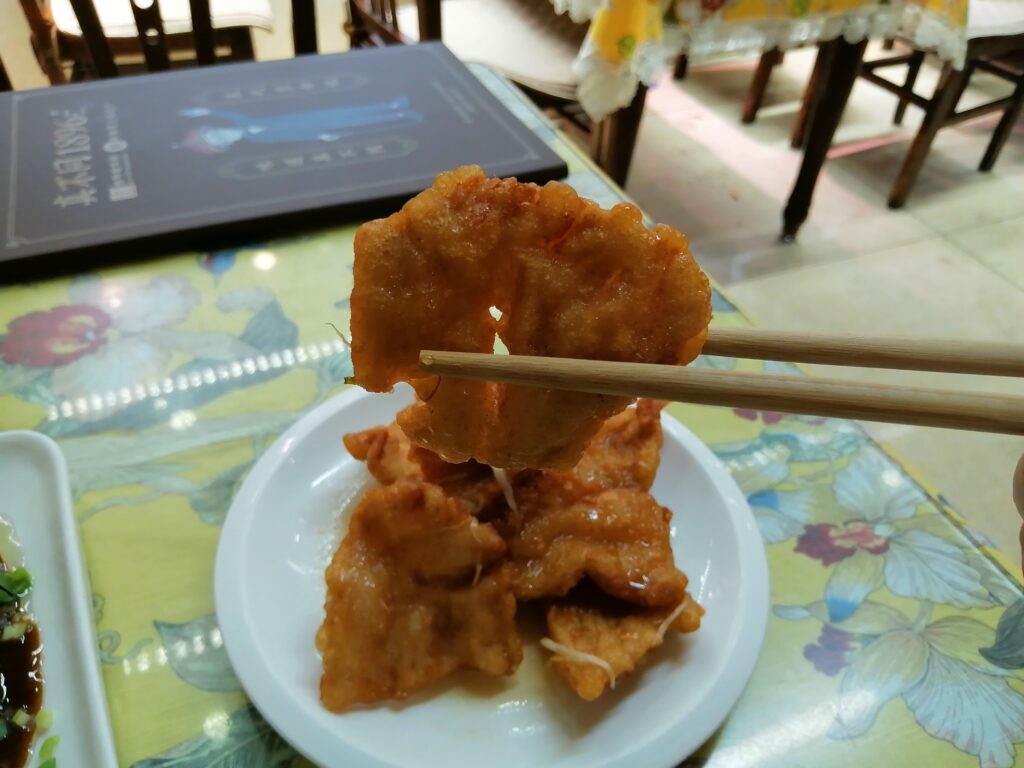 真不同で夕食 ここでの食事は前日に続き二回目、その時の印象がとても良かったのだ。まず酒は先日同様「純糧老焼酎52°」を注文、空きっ腹に一口ゴクッと飲み込むと五臓六腑にしみわたり歩き疲れた体に精気が戻る。料理は「鍋包肉」(豚肉唐揚の甘酢ソースがけ)と「肉絲扒全茄」(ナス煮込みに豚肉細切り炒めをかけたもの)の二品を注文、どちらも好みの味で大満足だ。旅も残り三日、元気な状態で帰宅できるように栄養をしっかりとるのだ・・・
