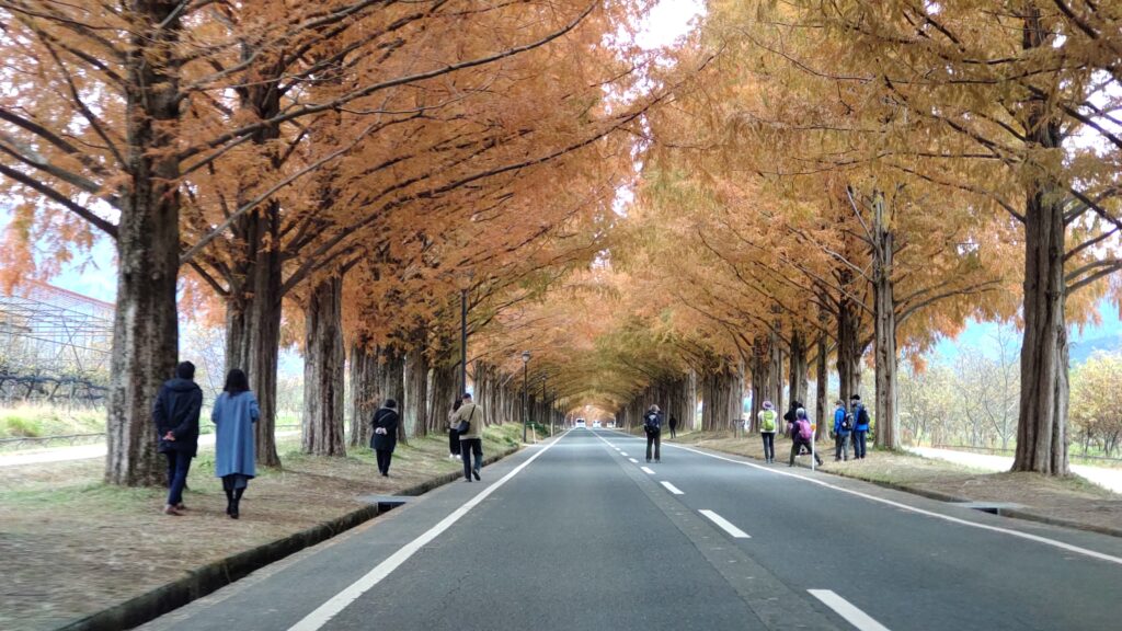翌日、おいしい朝食をいただく。その後部屋でひと休みしてから出発、久々にマキノ町のメタセコイア並木へ行った。この並木はどの季節に来てもそれぞれ違った姿を楽しめるが、今回はきれいな紅葉を見せてくれた。おしゃれな喫茶店でひと休み、私は酒飲みなので日本酒を注文、ほろ酔い気分で一泊二日のしゃもすきの旅も終わりを迎える・・・