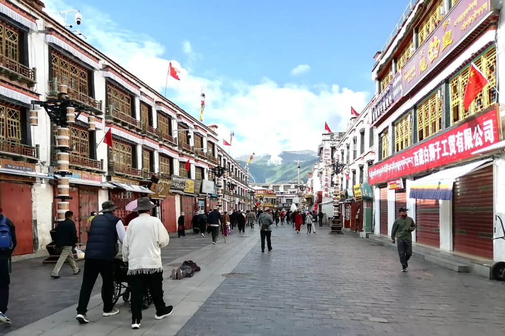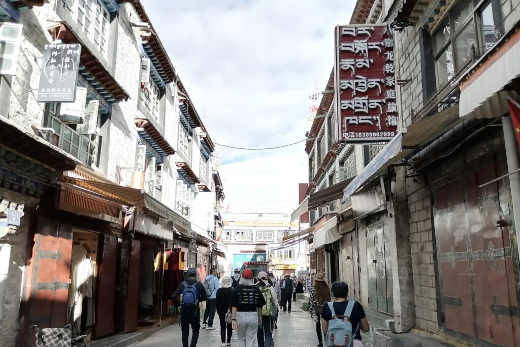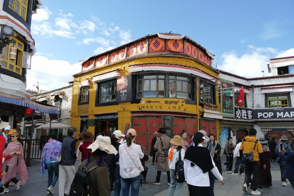 朝9時過ぎホテルを出発、徒歩10分でジョカン西門に到着。その間、家屋が密集する路地や八廓街を通る。八廓街では五体投地しながら少しずつ前へ進むで巡礼者の姿が見られた。テレビで見たことはあるが、実際に見るとインパクトがある。そして彼らの信心の強さを認識する。通りには様々な店舗が軒を連ね、黄色い外壁が目立つ有名なチベット料理店「瑪吉阿米(Makye Ame Restaurant)」の前も通る。