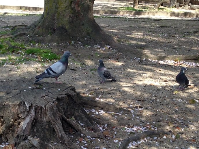 【解 説】 桜の季節、一羽のハトは切り株の上に立ち、周囲のハトたちを監視しているようである。そのなかに、他のハトとは違い、顔がまだら模様の珍しいハトがいるのがわかる。どうしてそのような姿になったのかは不明である。